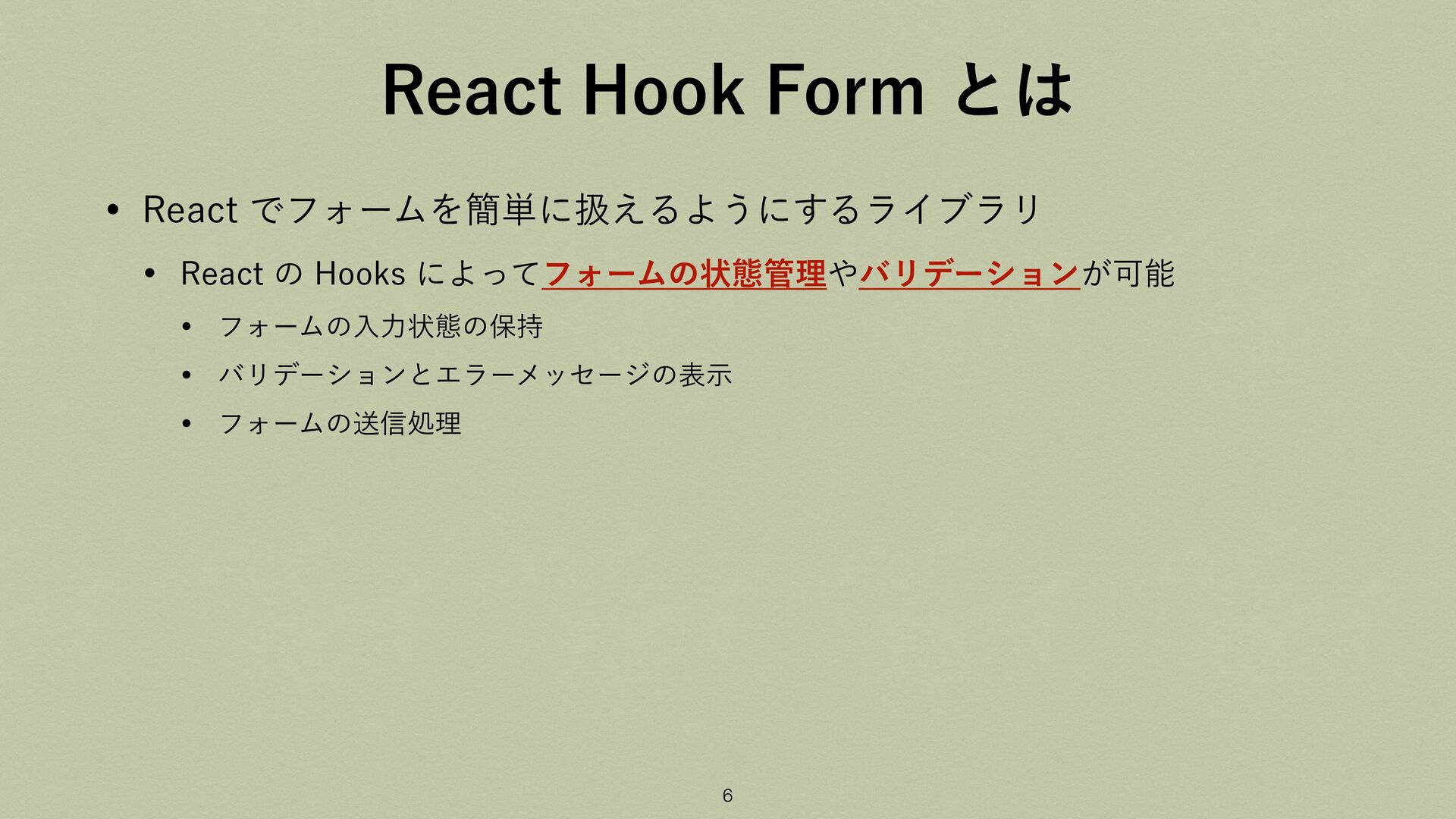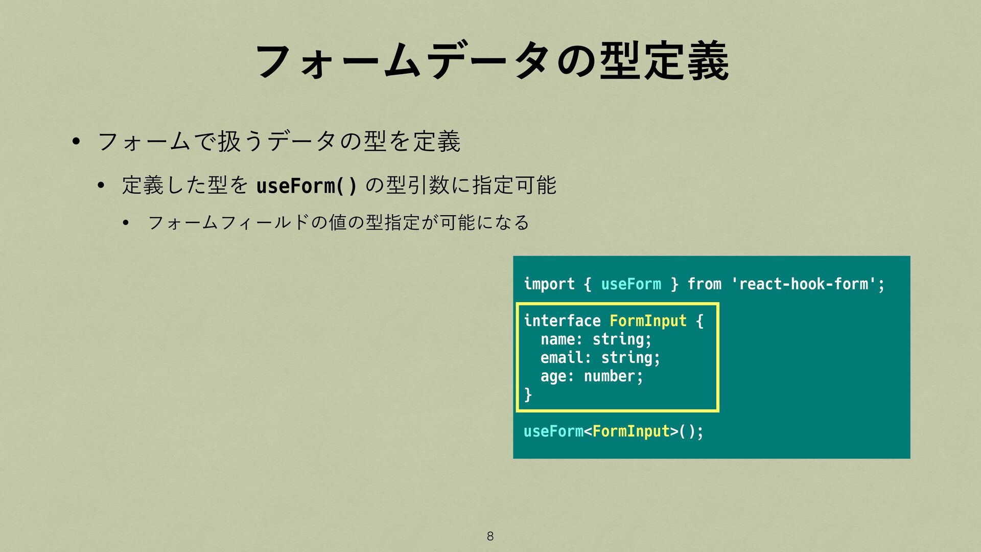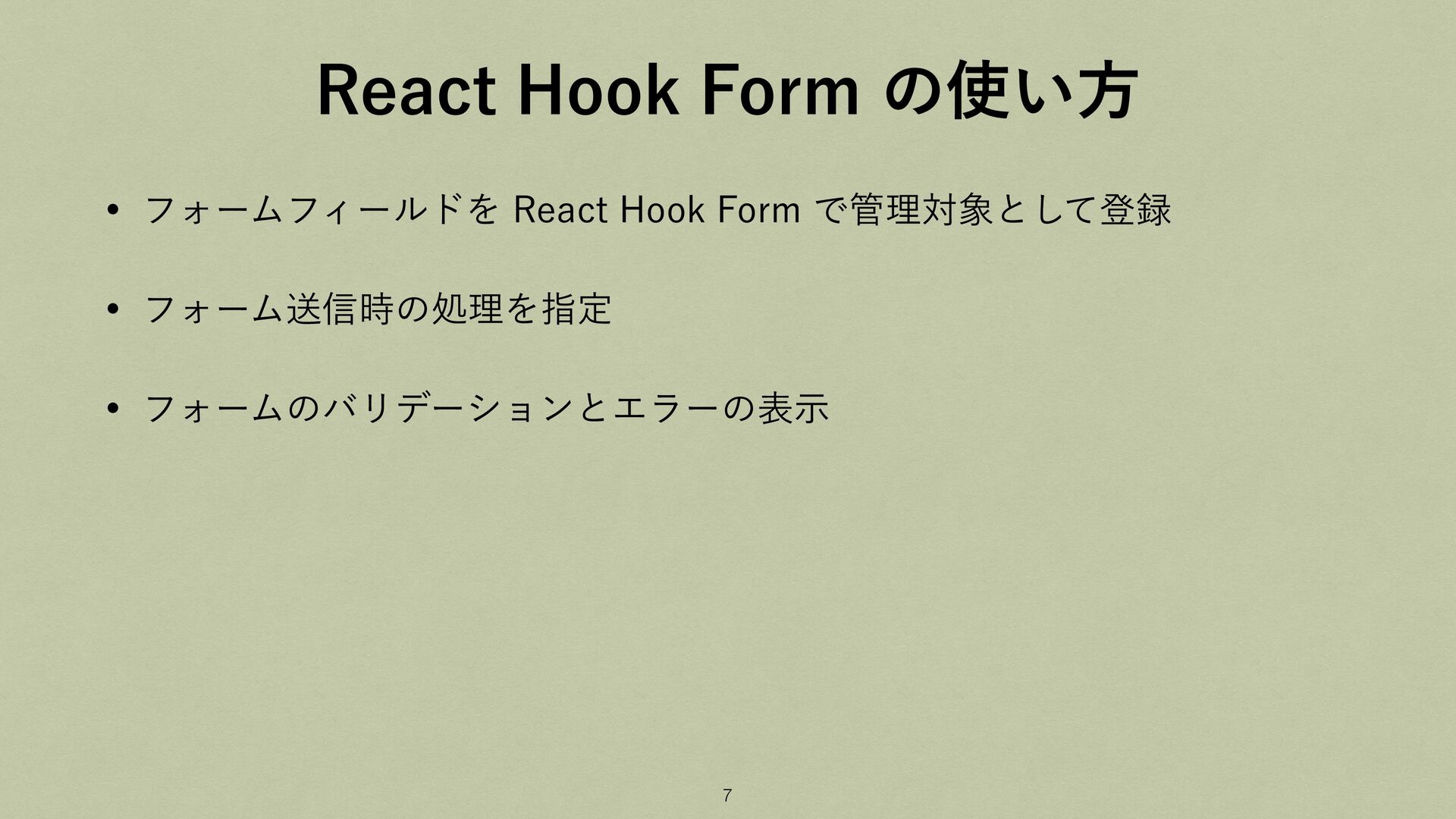 ϑΥʔϜϑΟʔϧυͷొ w VTF'PSNIPPL͔Βregister()Λऔಘ w ϑΥʔϜϑΟʔϧυΛ3FBDU)PPL'PSNͷཧରʹొ w register()ͷҾʹೖྗϑΥʔϜʹࢦఆ͢ΔҰҙͳ໊લΛࢦఆ w useForm()ͰܕҾΛࢦఆͨ͠߹ͦͷܕͷϓϩύςΟ໊ͷΈʹ੍͞ΕΔ w