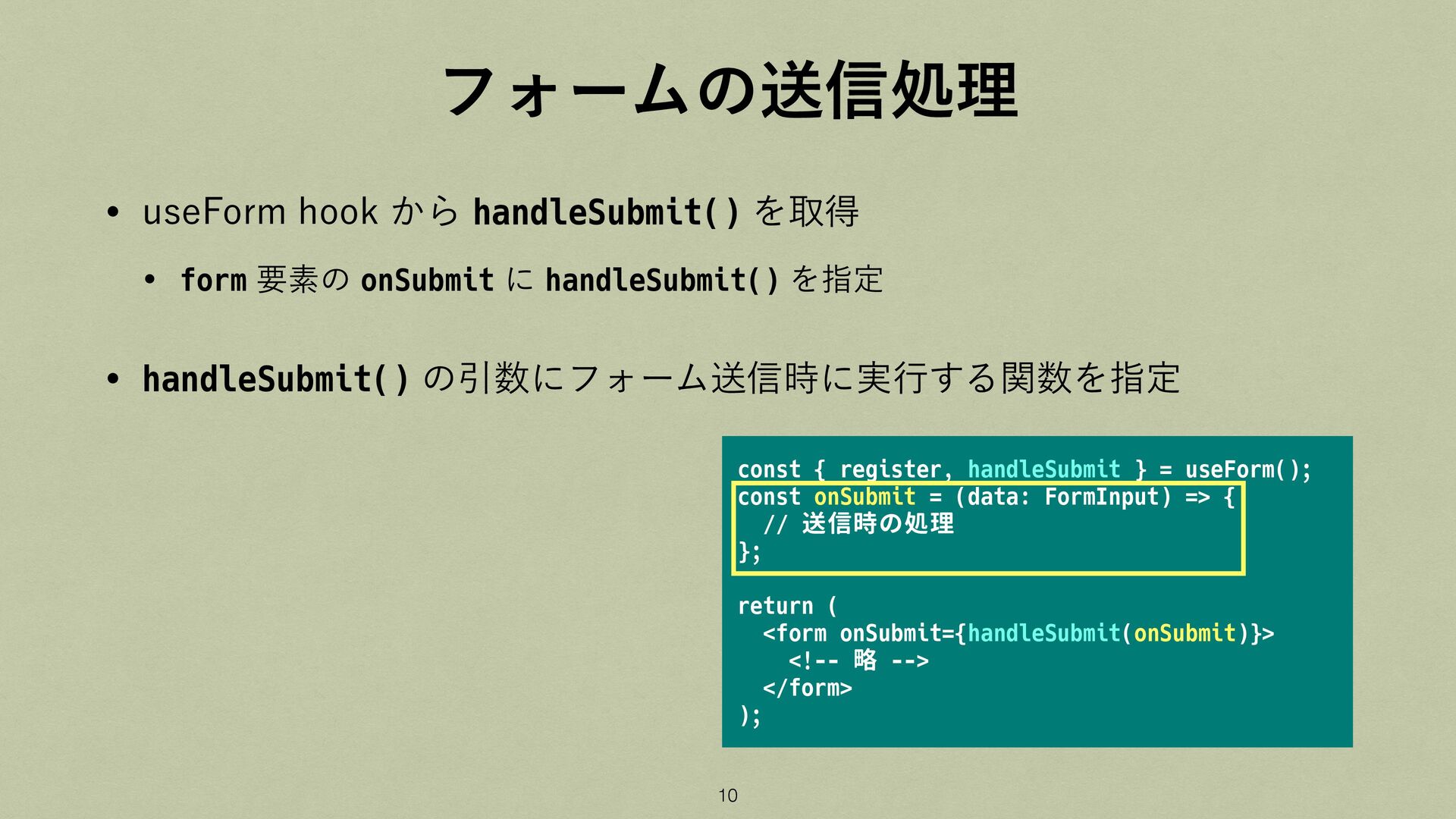 register, handleSubmit } = useForm(); const onSubmit = (data: FormInput) => { // 送信時の処理 }; return ( <form onSubmit={handleSubmit(onSubmit)}> <!-- 略 --> </form> );