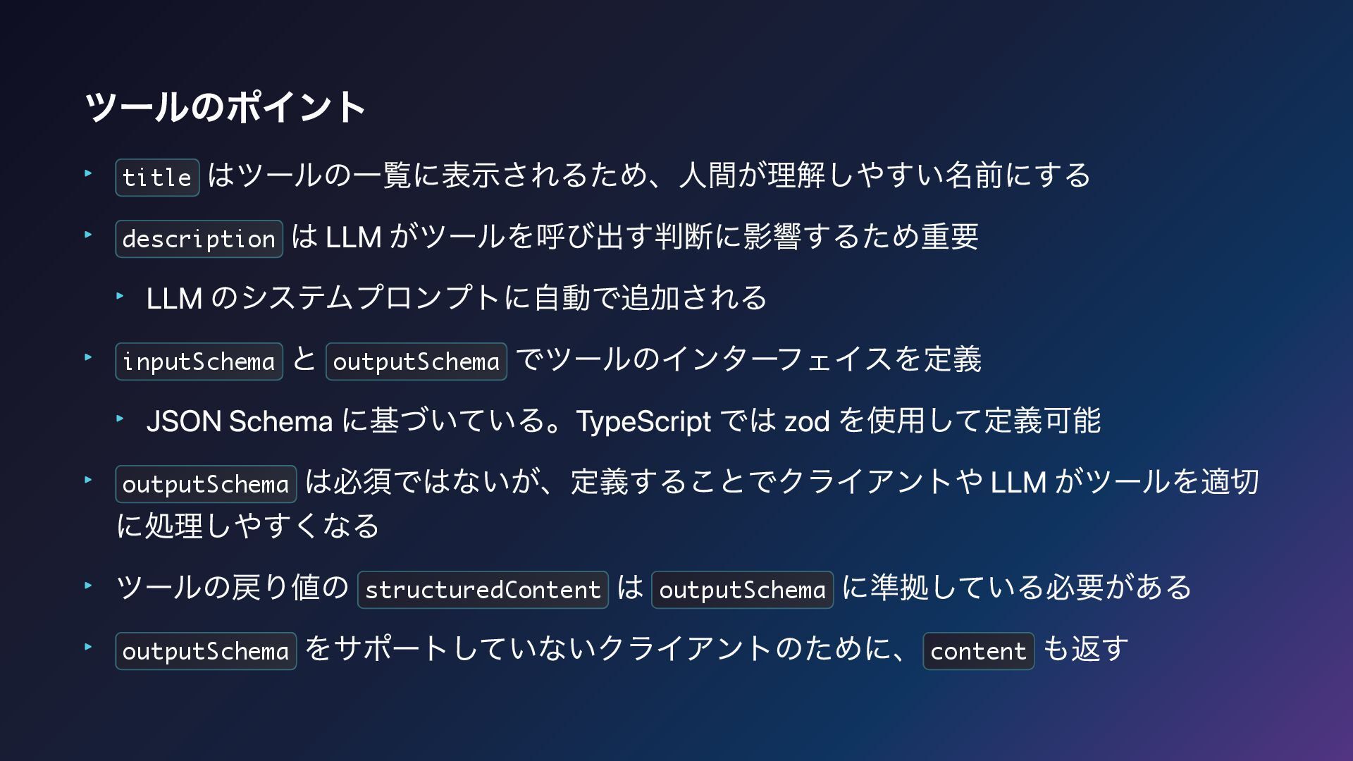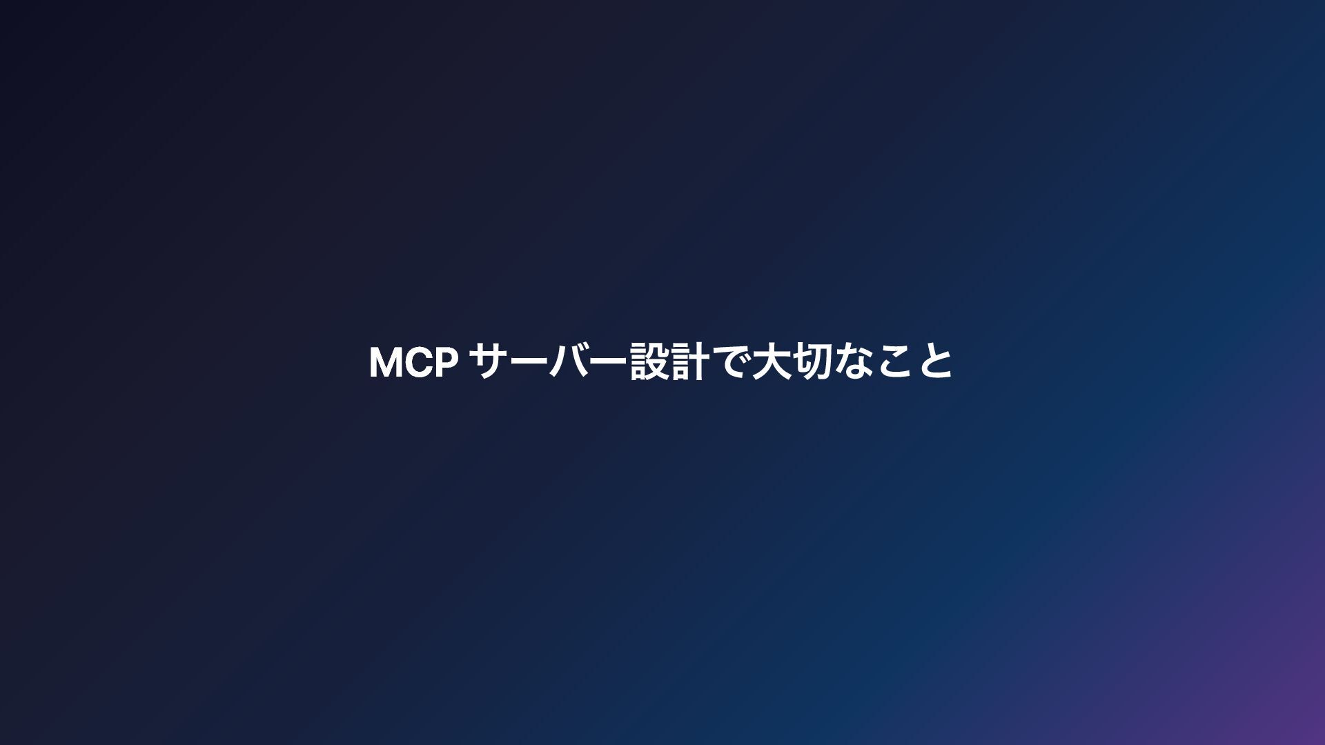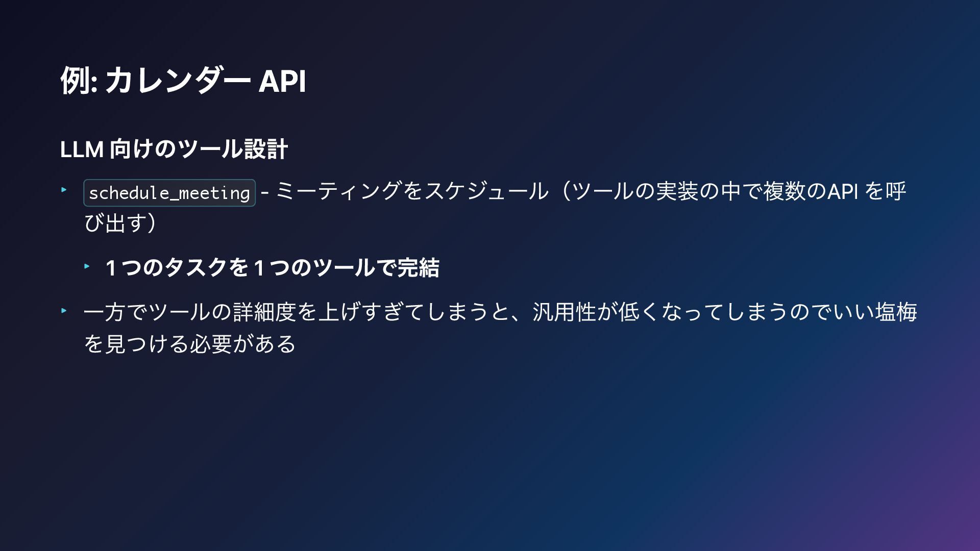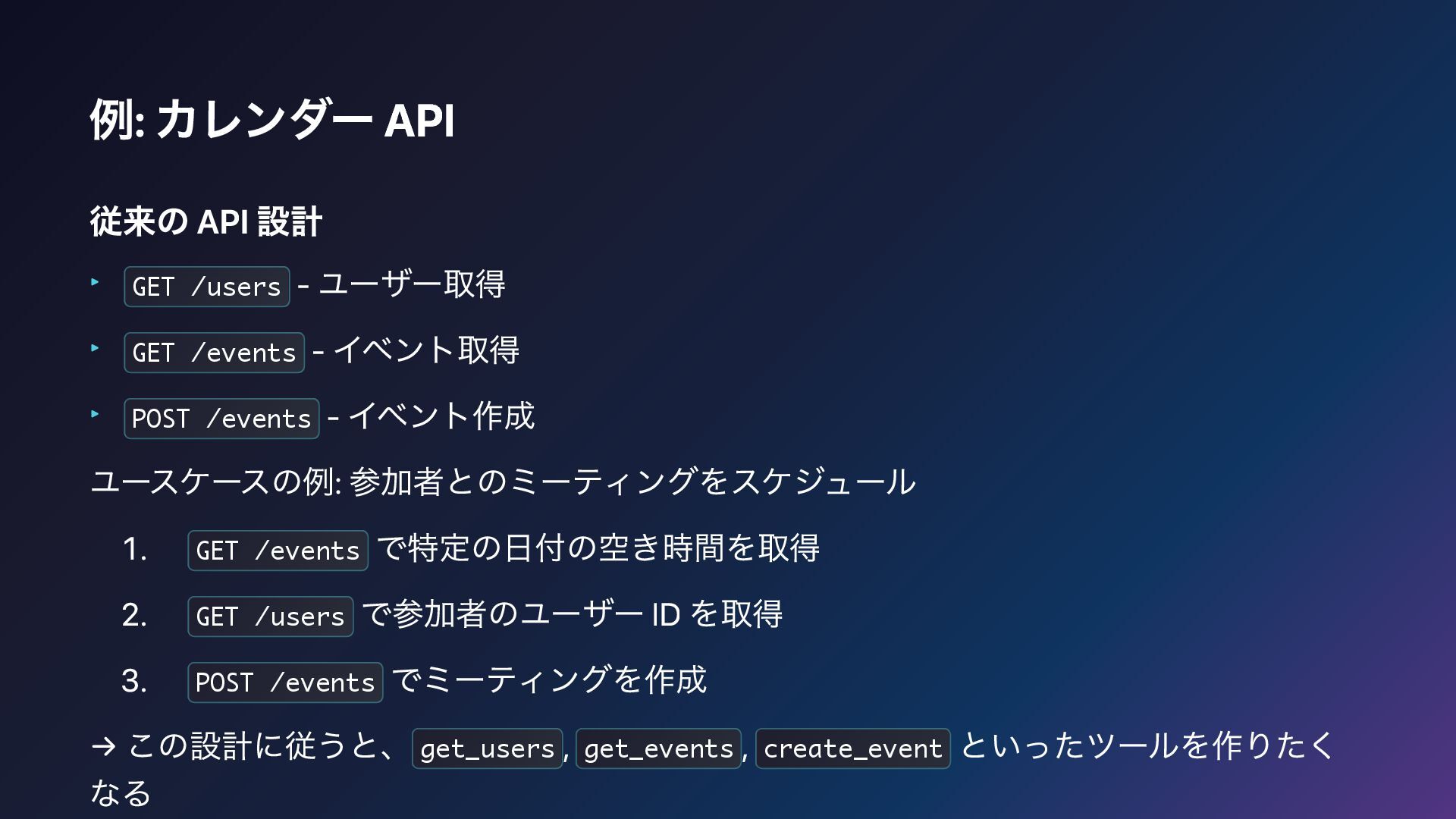 user = await searchUser(req.query.name); res.json(user); }); app.get("/get_events", async (req, res) => { const events = await getEvents(req.query.userId, req.query.date); res.json(events); }); app.post("/create_event", async (req, res) => { const event = await createEvent( req.body.title, req.body.attendeeIds, req.body.timeSlot, ); res.json(event); }); // MCP ツール: 1 つのツールでタスクを完結 server.registerTool( "schedule_meeting", { title: "Schedule Meeting", description: "指定したメンバーとのミーティングをスケジュール", inputSchema: { attendeeName: z.string().describe("参加者の名前"), title: z.string().describe("ミーティングのタイトル"), date: z.string().describe("日付(YYYY-MM-DD)"), duration: z.number().describe("所要時間(分)"), }, outputSchema: { eventId: z.string(), startTime: z.string() }, }, async ({ attendeeName, title, date, duration }) => { // ツール内部で全ての処理を実行 const user = await searchUser(attendeeName); const freeSlot = await findFreeSlot(user.id, date, duration); const event = await createEvent(title, [user.id], freeSlot); return { content: [{ type: "text", text: `ミーティングを作成しました` }], structuredContent: { eventId: event.id, startTime: freeSlot.start }, }; }, );
