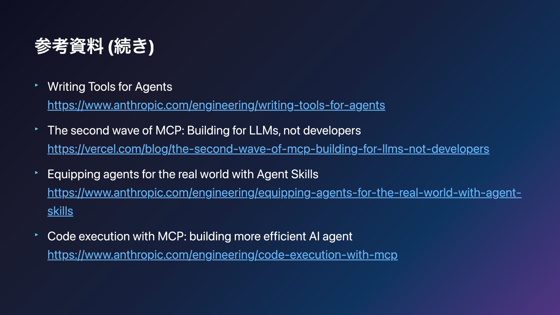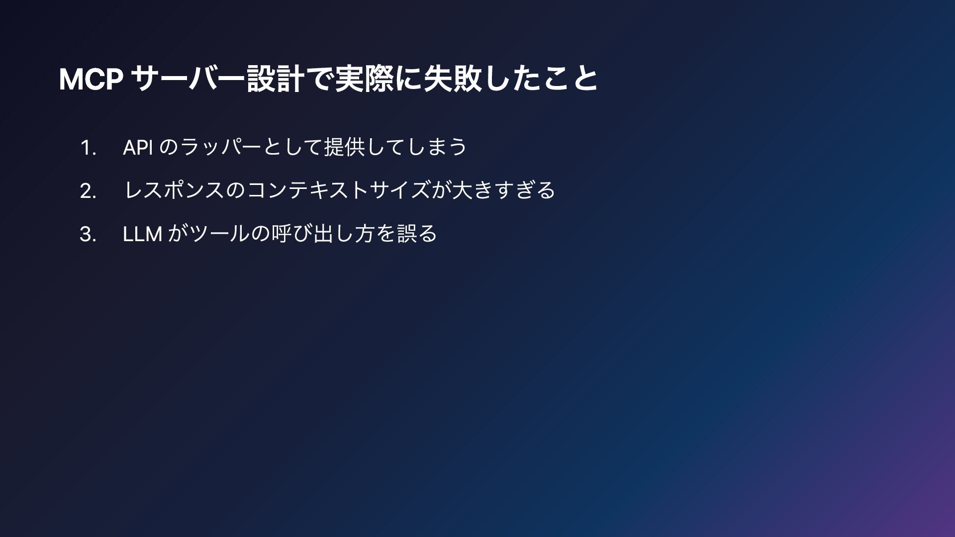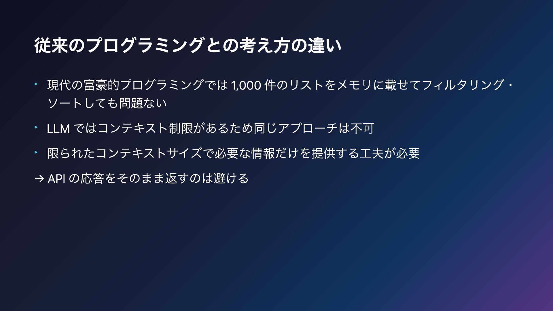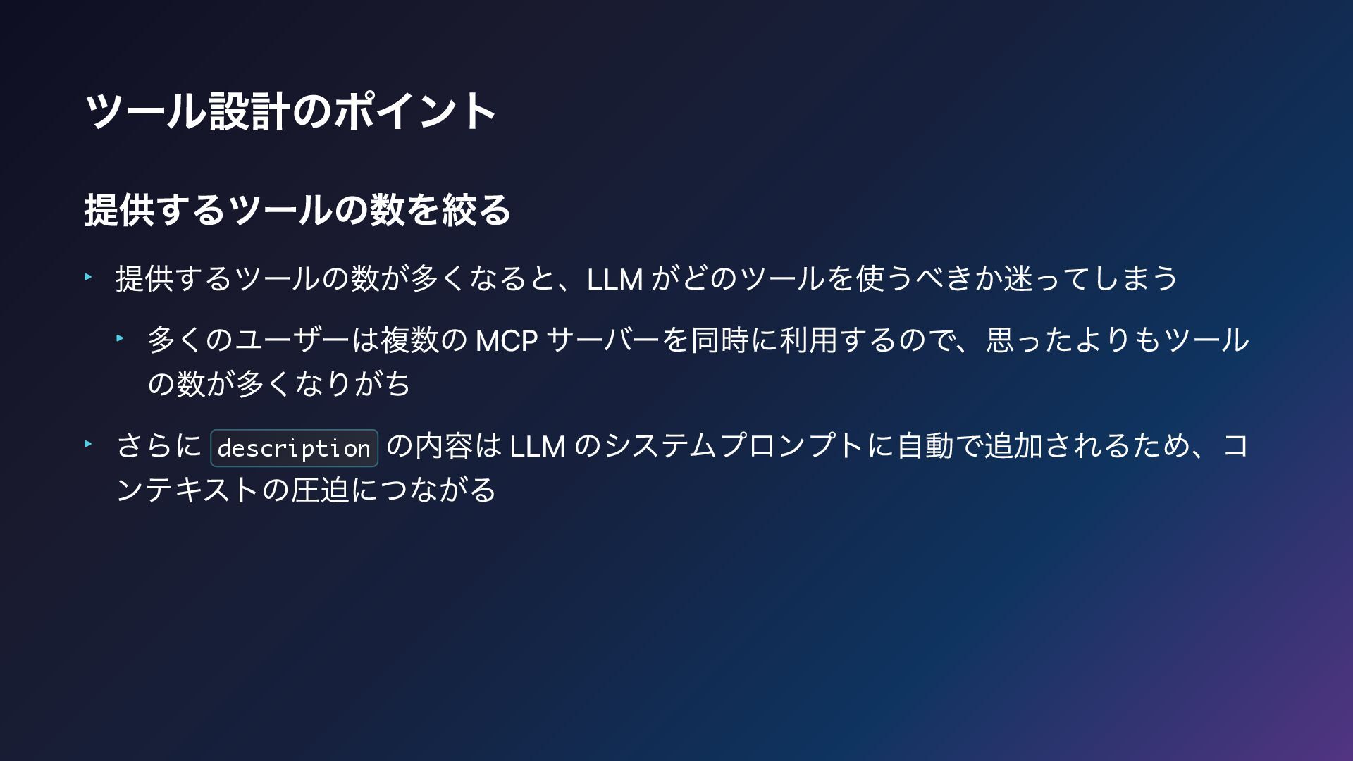 user = await searchUser(req.query.name); res.json(user); }); app.get("/get_events", async (req, res) => { const events = await getEvents(req.query.userId, req.query.date); res.json(events); }); app.post("/create_event", async (req, res) => { const event = await createEvent( req.body.title, req.body.attendeeIds, req.body.timeSlot, ); res.json(event); }); // MCP ツール: 1 つのツールでタスクを完結 server.registerTool( "schedule_meeting", { title: "Schedule Meeting", description: "指定したメンバーとのミーティングをスケジュール", inputSchema: { attendeeName: z.string().describe("参加者の名前"), title: z.string().describe("ミーティングのタイトル"), date: z.string().describe("日付(YYYY-MM-DD)"), duration: z.number().describe("所要時間(分)"), }, outputSchema: { eventId: z.string(), startTime: z.string() }, }, async ({ attendeeName, title, date, duration }) => { // ツール内部で全ての処理を実行 const user = await searchUser(attendeeName); const freeSlot = await findFreeSlot(user.id, date, duration); const event = await createEvent(title, [user.id], freeSlot); return { content: [{ type: "text", text: `ミーティングを作成しました` }], structuredContent: { eventId: event.id, startTime: freeSlot.start }, }; }, );