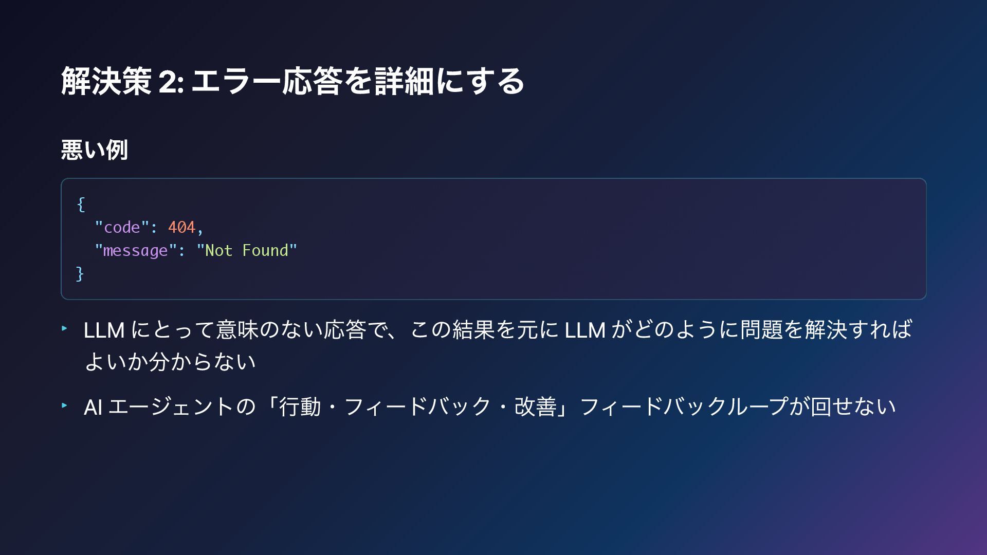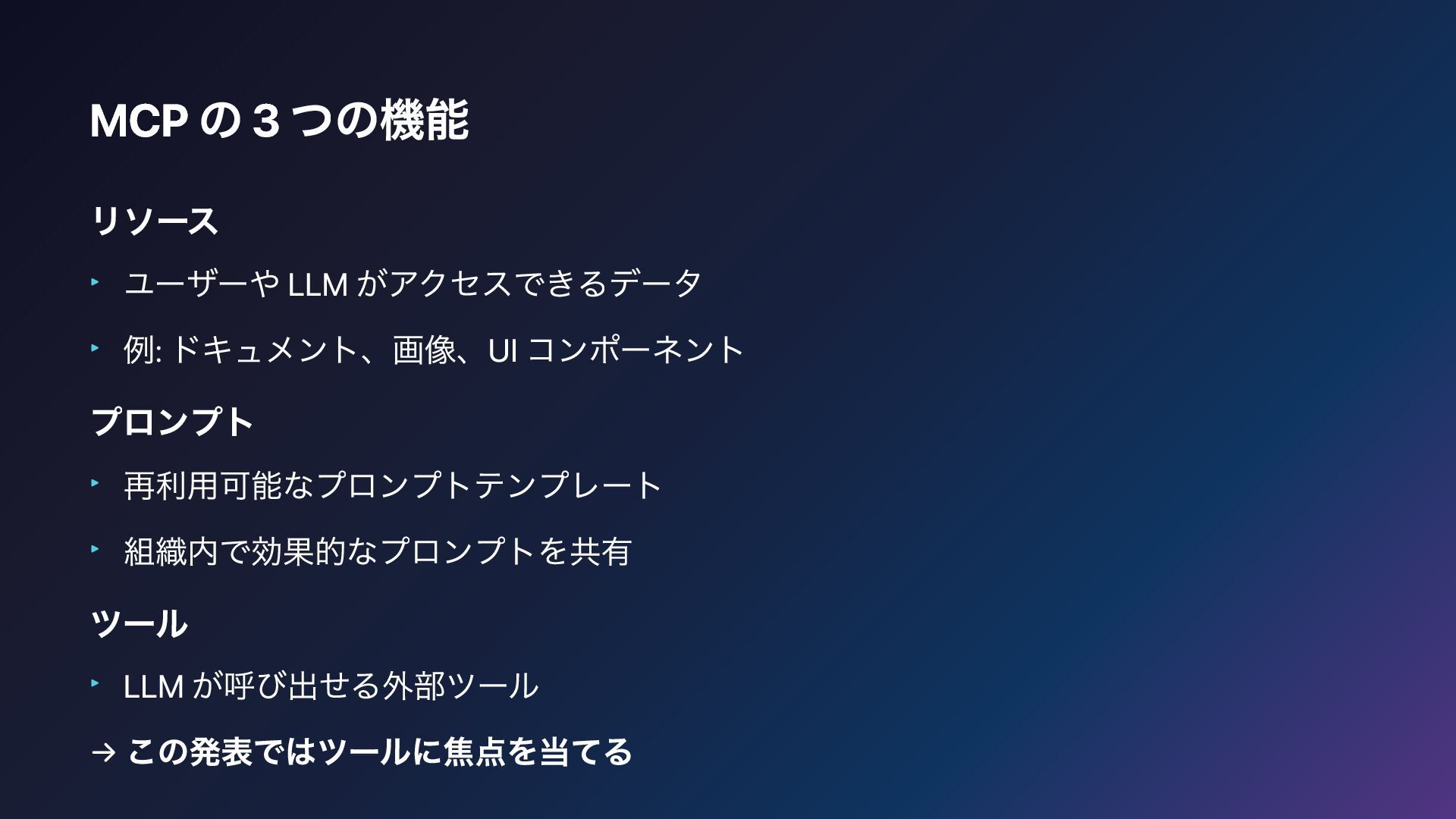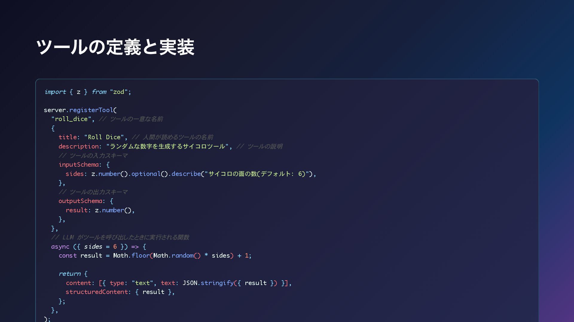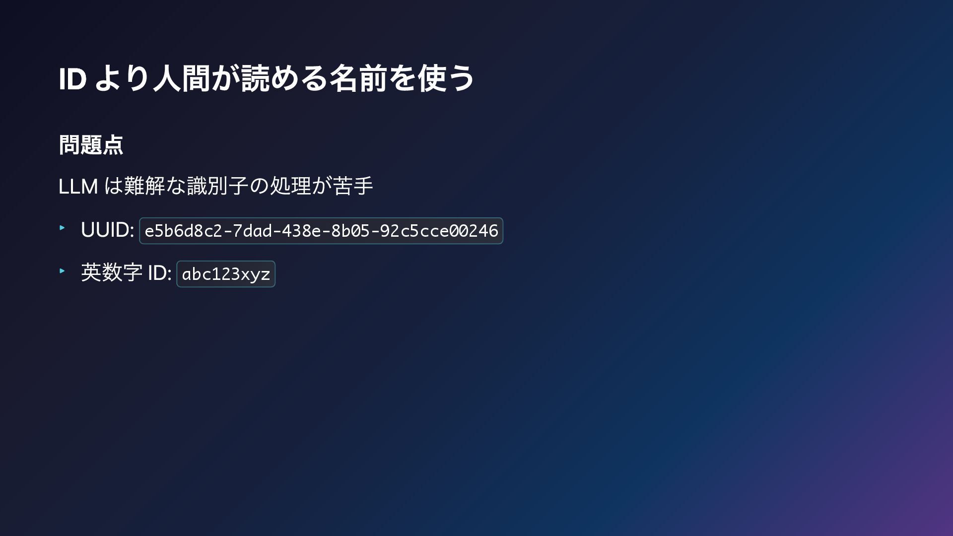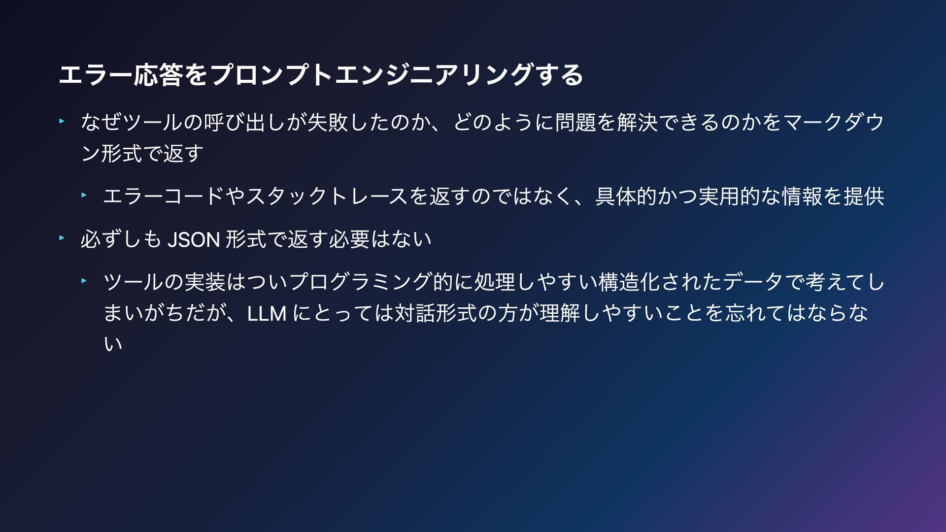 user = await searchUser(req.query.name); res.json(user); }); app.get("/get_events", async (req, res) => { const events = await getEvents(req.query.userId, req.query.date); res.json(events); }); app.post("/create_event", async (req, res) => { const event = await createEvent( req.body.title, req.body.attendeeIds, req.body.timeSlot, ); res.json(event); }); // MCP ツール: 1 つのツールでタスクを完結 server.registerTool( "schedule_meeting", { title: "Schedule Meeting", description: "指定したメンバーとのミーティングをスケジュール", inputSchema: { attendeeName: z.string().describe("参加者の名前"), title: z.string().describe("ミーティングのタイトル"), date: z.string().describe("日付(YYYY-MM-DD)"), duration: z.number().describe("所要時間(分)"), }, outputSchema: { eventId: z.string(), startTime: z.string() }, }, async ({ attendeeName, title, date, duration }) => { // ツール内部で全ての処理を実行 const user = await searchUser(attendeeName); const freeSlot = await findFreeSlot(user.id, date, duration); const event = await createEvent(title, [user.id], freeSlot); return { content: [{ type: "text", text: `ミーティングを作成しました` }], structuredContent: { eventId: event.id, startTime: freeSlot.start }, }; }, );