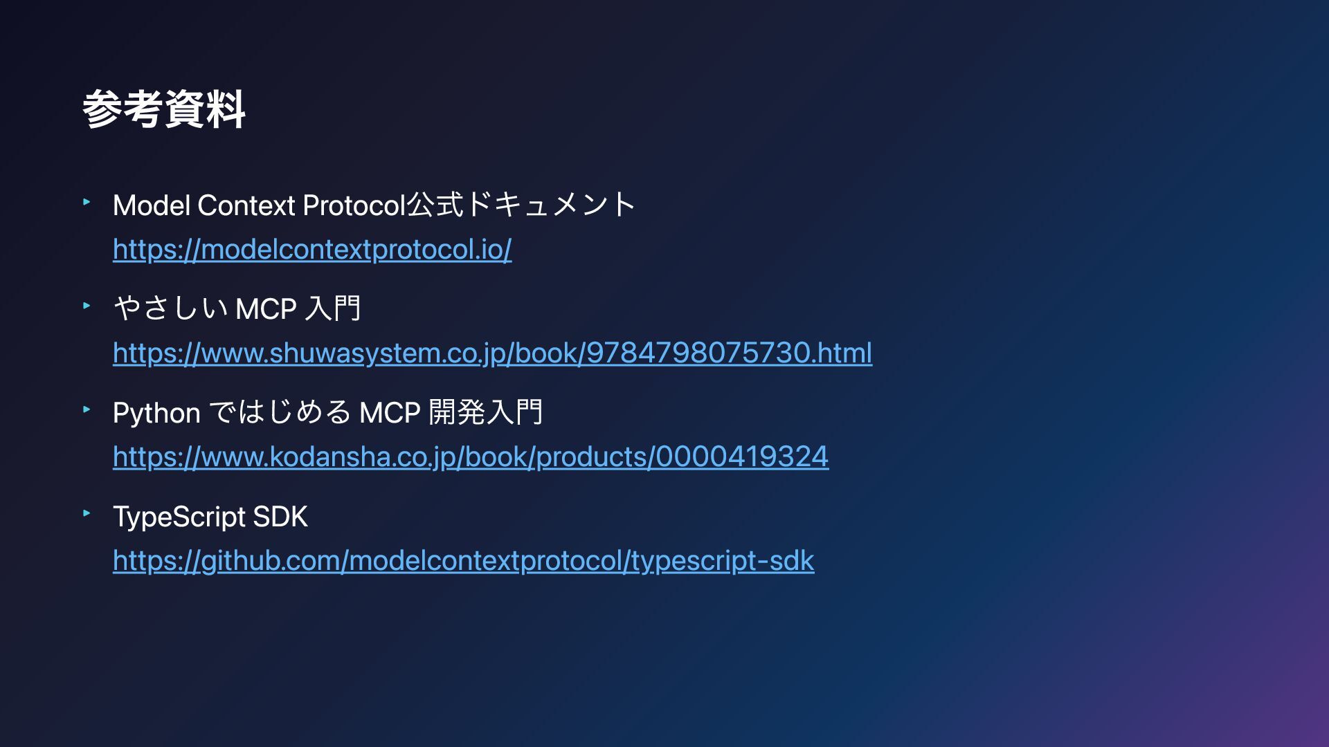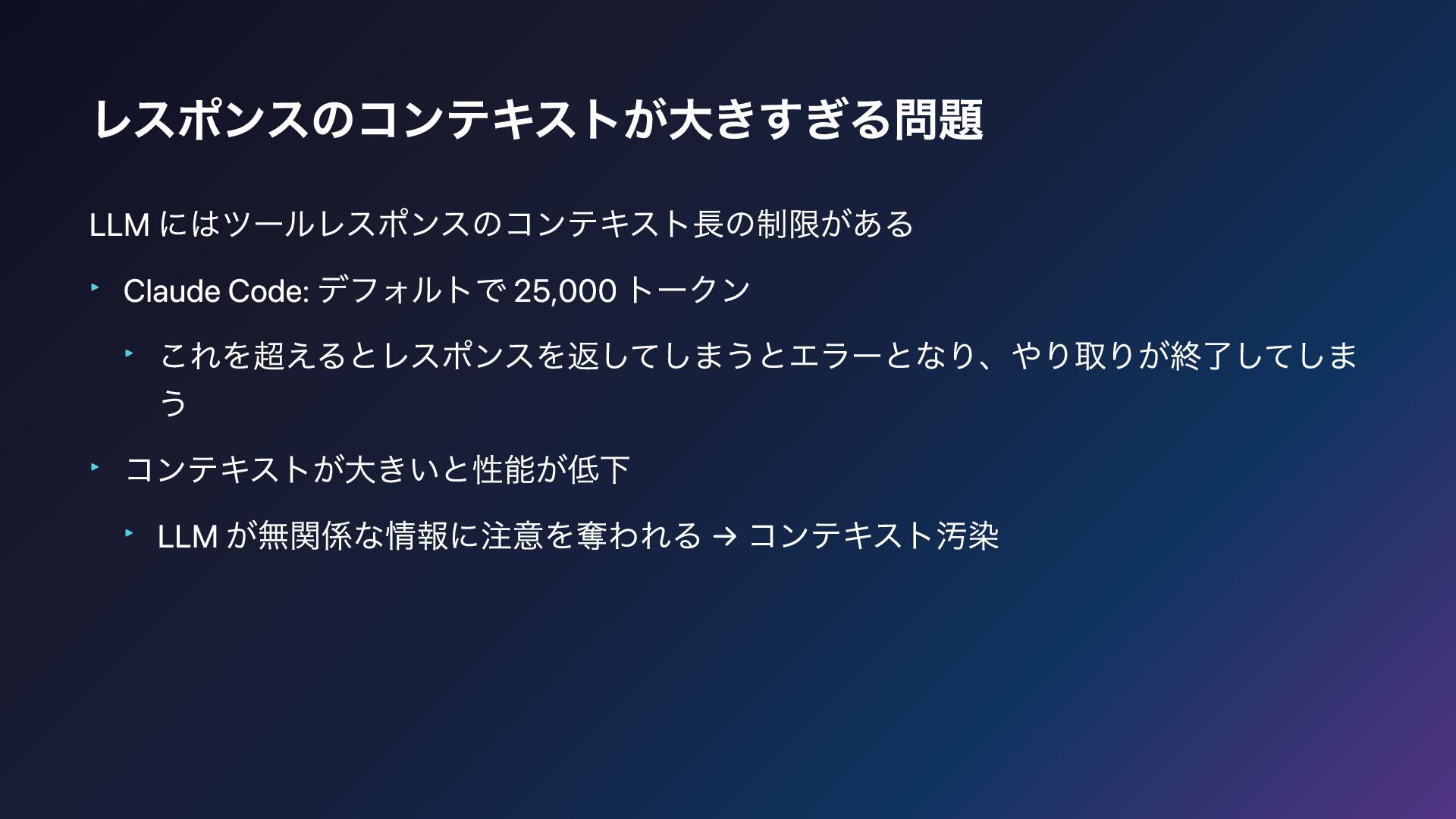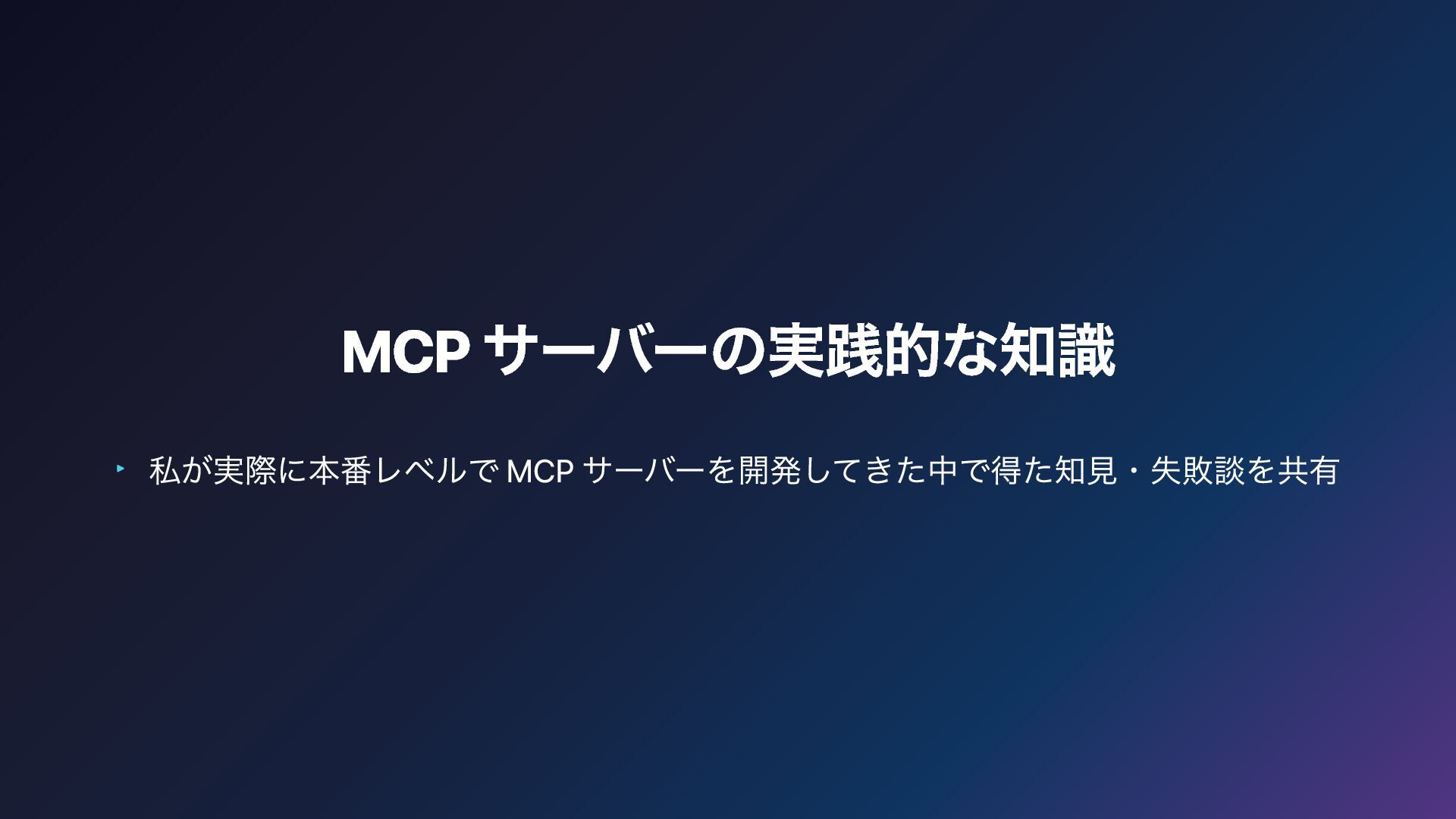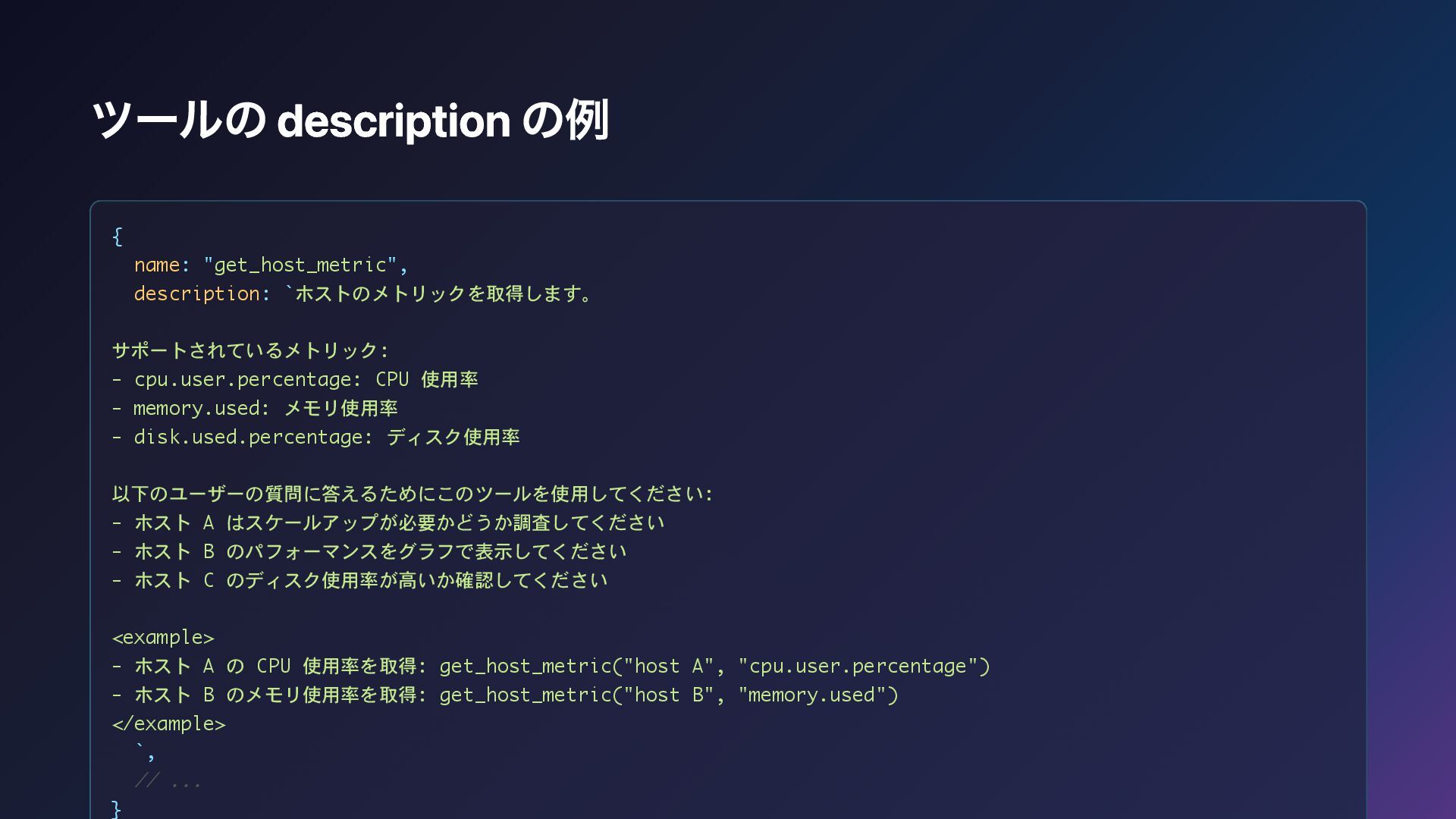 user = await searchUser(req.query.name); res.json(user); }); app.get("/get_events", async (req, res) => { const events = await getEvents(req.query.userId, req.query.date); res.json(events); }); app.post("/create_event", async (req, res) => { const event = await createEvent( req.body.title, req.body.attendeeIds, req.body.timeSlot, ); res.json(event); }); // MCP ツール: 1 つのツールでタスクを完結 server.registerTool( "schedule_meeting", { title: "Schedule Meeting", description: "指定したメンバーとのミーティングをスケジュール", inputSchema: { attendeeName: z.string().describe("参加者の名前"), title: z.string().describe("ミーティングのタイトル"), date: z.string().describe("日付(YYYY-MM-DD)"), duration: z.number().describe("所要時間(分)"), }, outputSchema: { eventId: z.string(), startTime: z.string() }, }, async ({ attendeeName, title, date, duration }) => { // ツール内部で全ての処理を実行 const user = await searchUser(attendeeName); const freeSlot = await findFreeSlot(user.id, date, duration); const event = await createEvent(title, [user.id], freeSlot); return { content: [{ type: "text", text: `ミーティングを作成しました` }], structuredContent: { eventId: event.id, startTime: freeSlot.start }, }; }, );