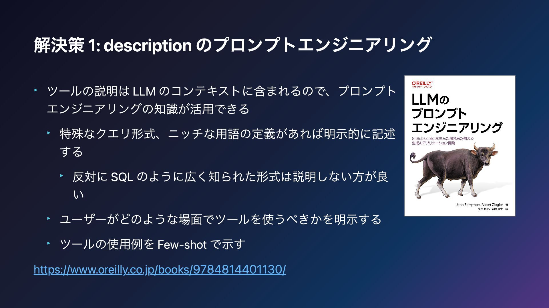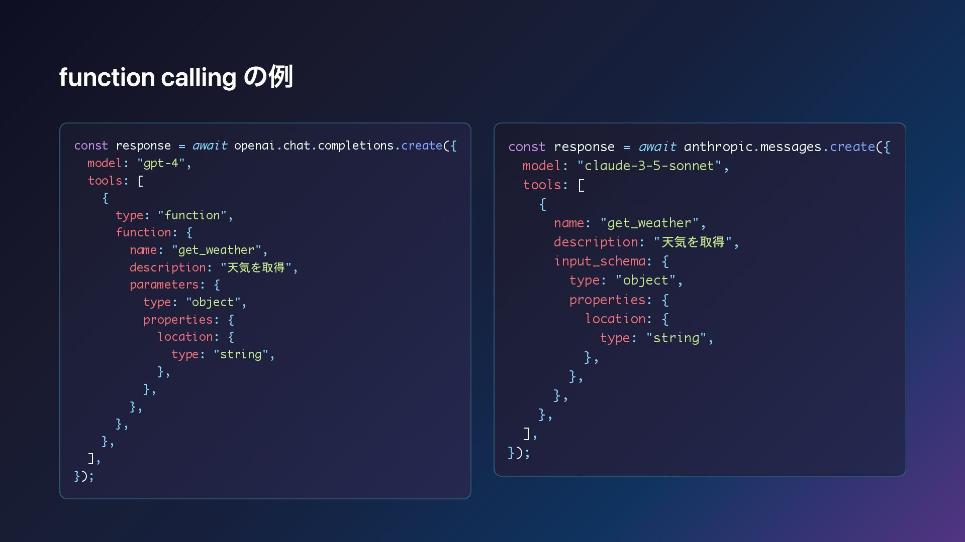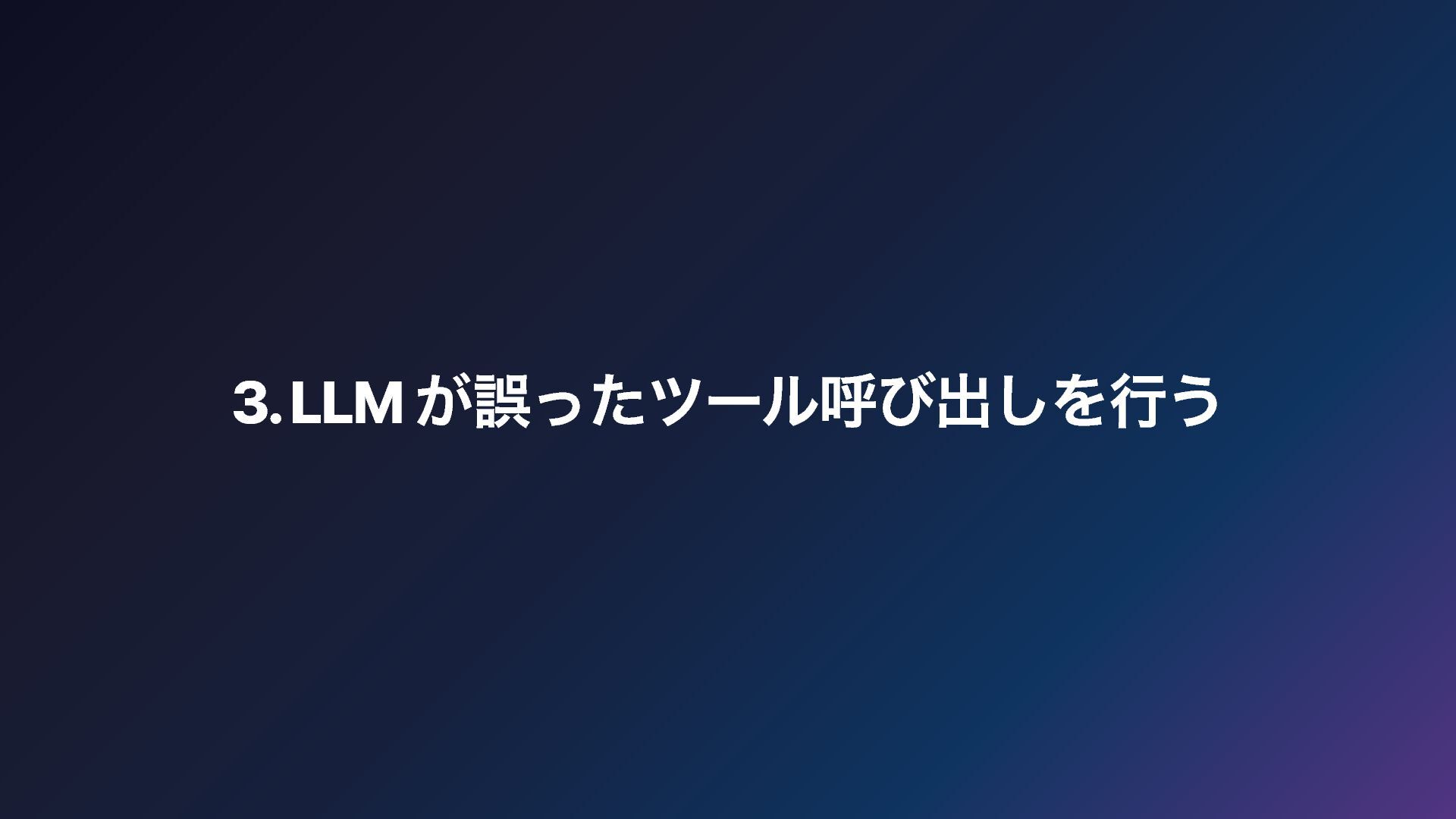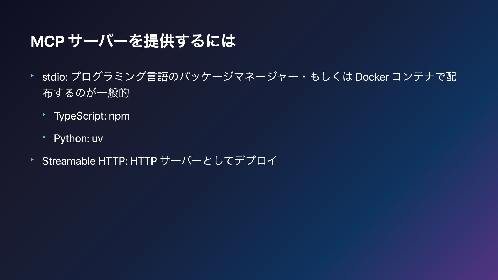 user = await searchUser(req.query.name); res.json(user); }); app.get("/get_events", async (req, res) => { const events = await getEvents(req.query.userId, req.query.date); res.json(events); }); app.post("/create_event", async (req, res) => { const event = await createEvent( req.body.title, req.body.attendeeIds, req.body.timeSlot, ); res.json(event); }); // MCP ツール: 1 つのツールでタスクを完結 server.registerTool( "schedule_meeting", { title: "Schedule Meeting", description: "指定したメンバーとのミーティングをスケジュール", inputSchema: { attendeeName: z.string().describe("参加者の名前"), title: z.string().describe("ミーティングのタイトル"), date: z.string().describe("日付(YYYY-MM-DD)"), duration: z.number().describe("所要時間(分)"), }, outputSchema: { eventId: z.string(), startTime: z.string() }, }, async ({ attendeeName, title, date, duration }) => { // ツール内部で全ての処理を実行 const user = await searchUser(attendeeName); const freeSlot = await findFreeSlot(user.id, date, duration); const event = await createEvent(title, [user.id], freeSlot); return { content: [{ type: "text", text: `ミーティングを作成しました` }], structuredContent: { eventId: event.id, startTime: freeSlot.start }, }; }, );