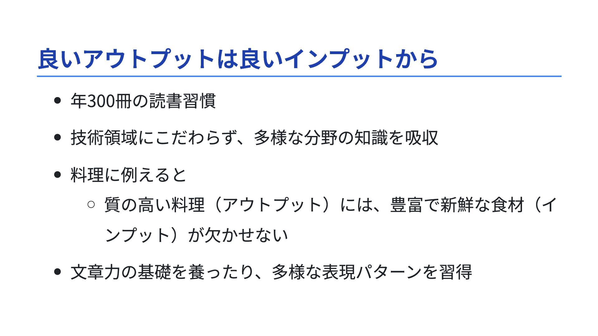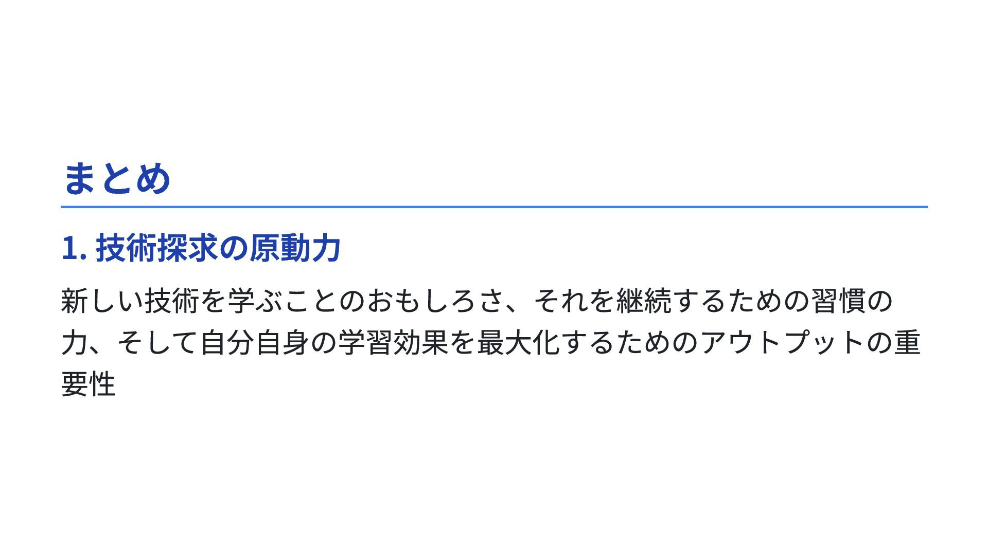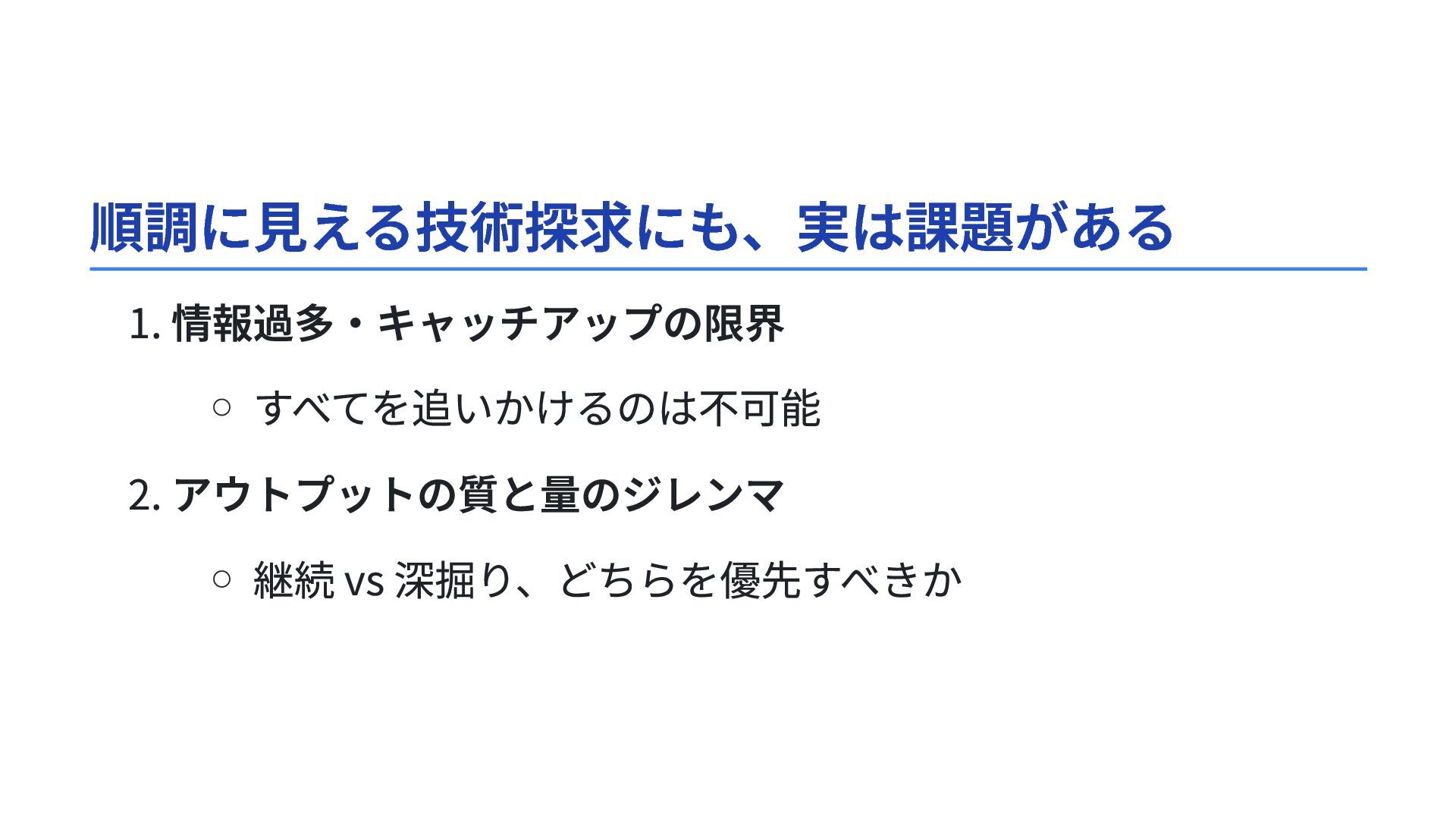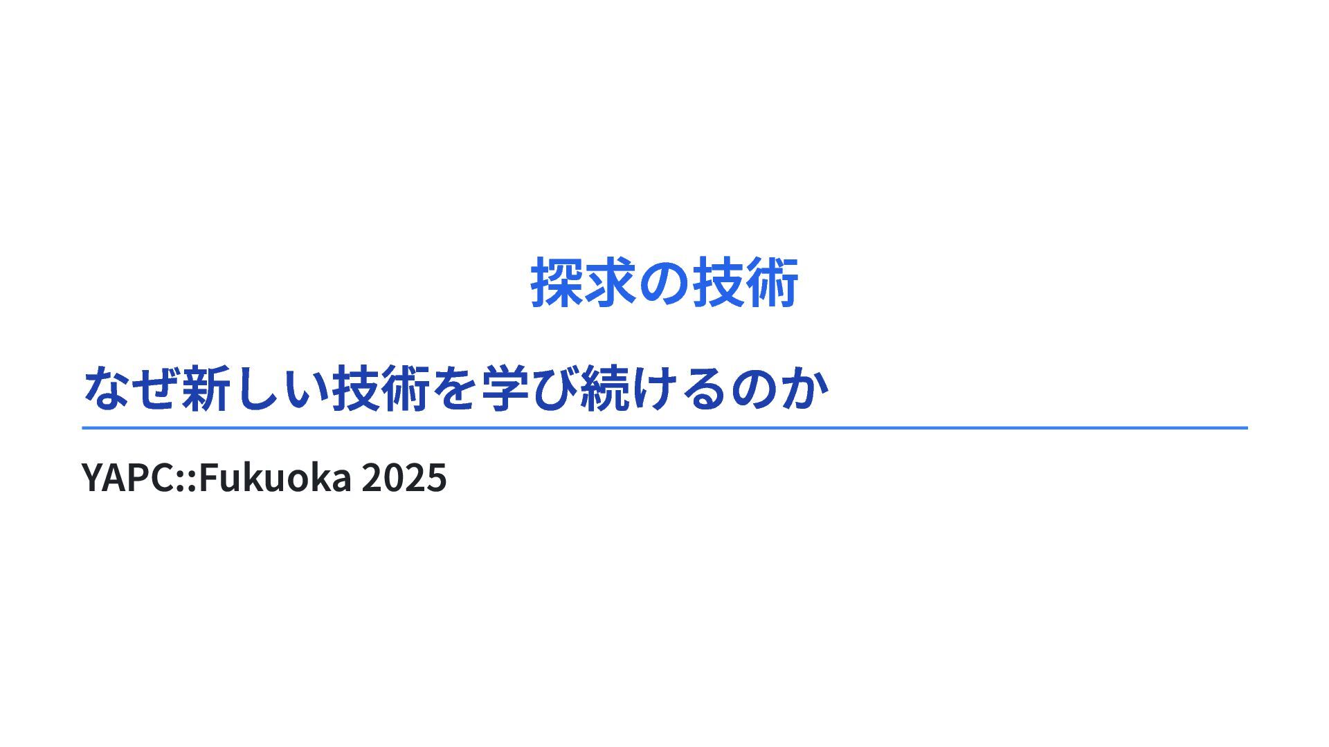 本発表では、急速に進化する技術の世界において、いかに効果的に新しい技術を探求し、その知見を価値あるアウトプットに変換していくかについて、実践的な方法論を共有します。 私は毎週技術ブログを執筆し、年間300冊の本を読むという活動を続けています。この継続的な探求活動から得られた知見を基に、技術者として成長し続けるための具体的なテクニックをお伝えします。