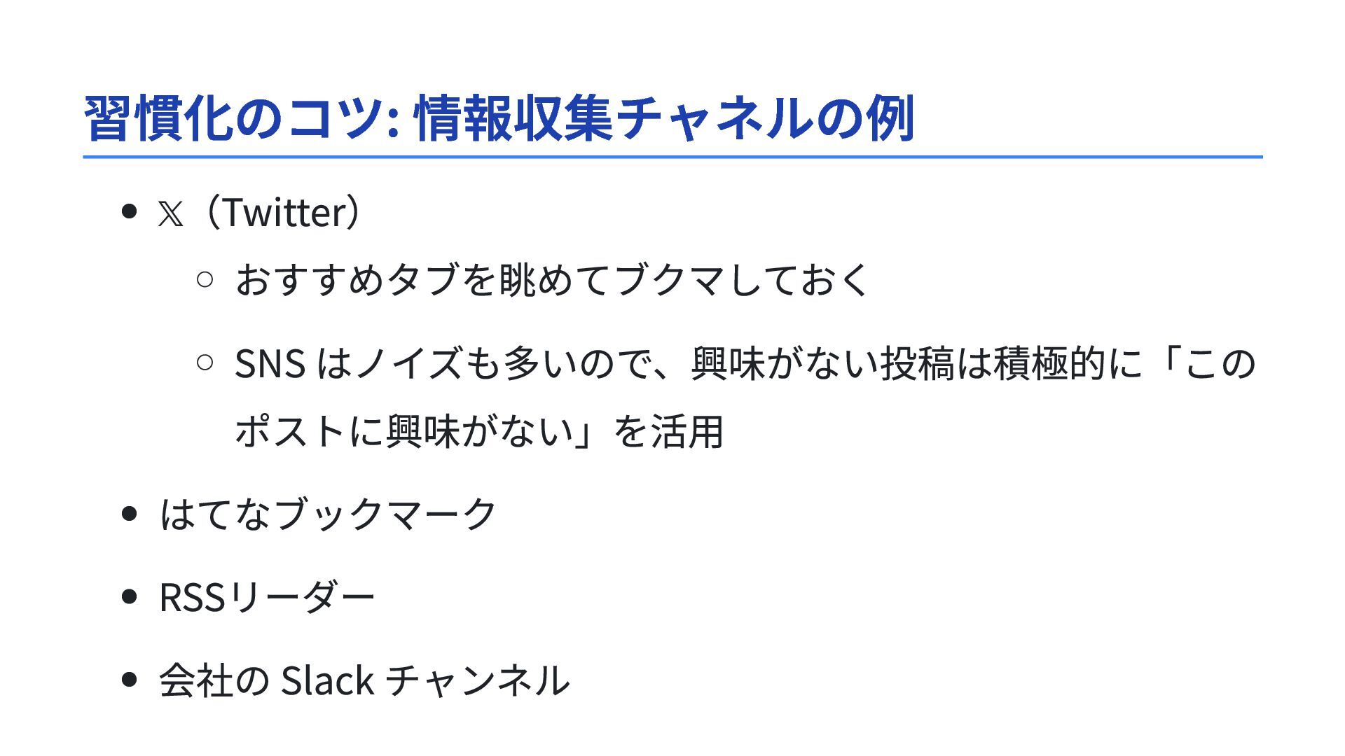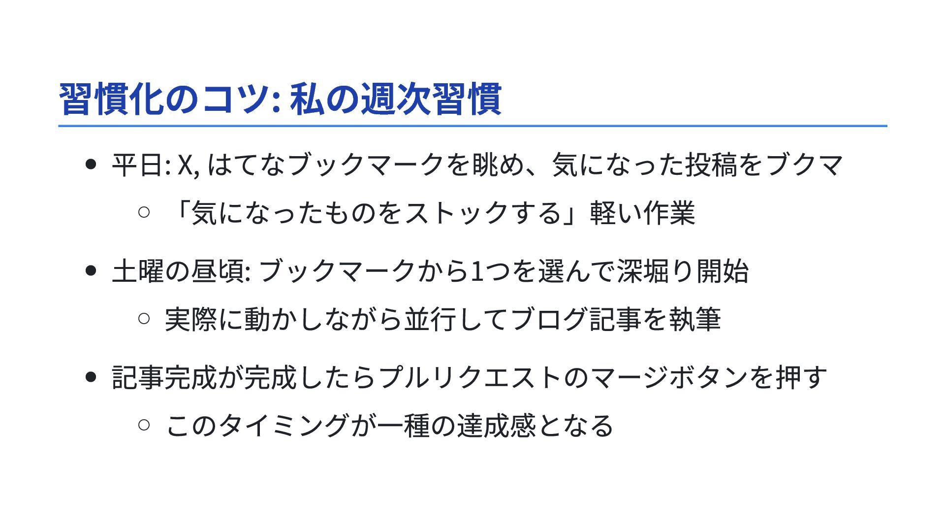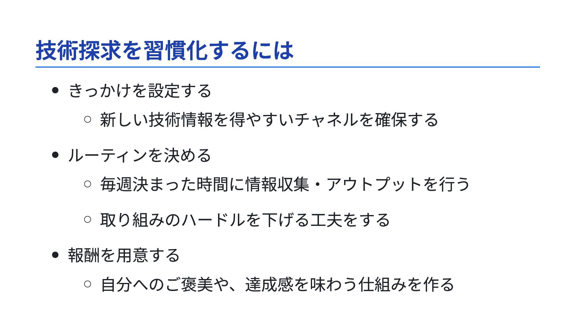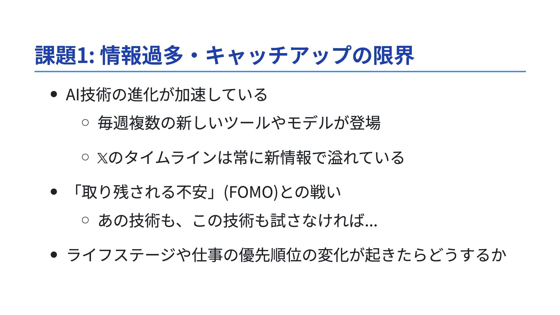 本発表では、急速に進化する技術の世界において、いかに効果的に新しい技術を探求し、その知見を価値あるアウトプットに変換していくかについて、実践的な方法論を共有します。 私は毎週技術ブログを執筆し、年間300冊の本を読むという活動を続けています。この継続的な探求活動から得られた知見を基に、技術者として成長し続けるための具体的なテクニックをお伝えします。