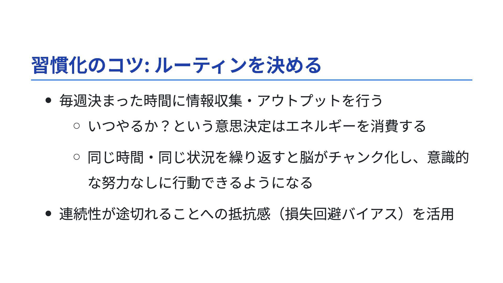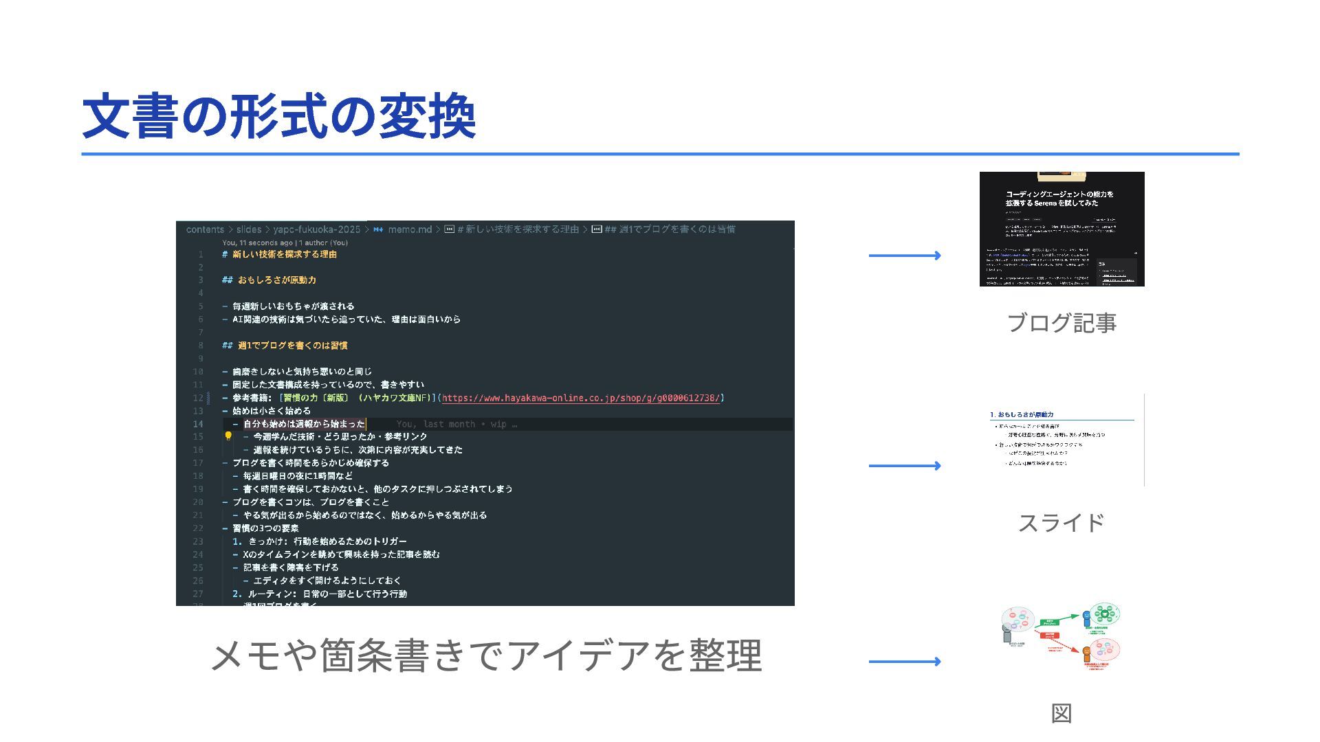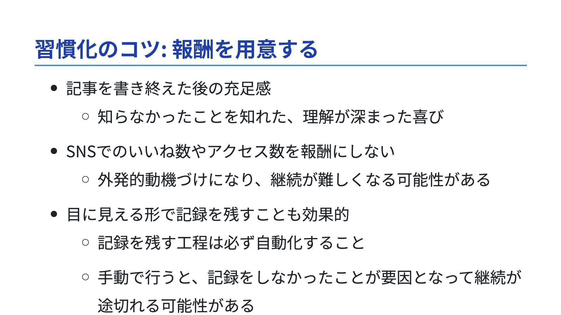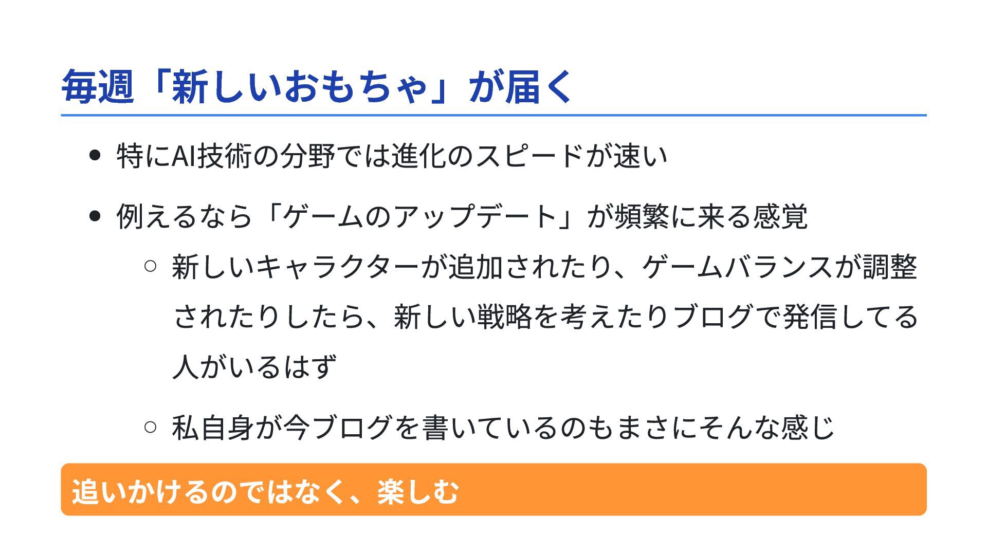 本発表では、急速に進化する技術の世界において、いかに効果的に新しい技術を探求し、その知見を価値あるアウトプットに変換していくかについて、実践的な方法論を共有します。 私は毎週技術ブログを執筆し、年間300冊の本を読むという活動を続けています。この継続的な探求活動から得られた知見を基に、技術者として成長し続けるための具体的なテクニックをお伝えします。