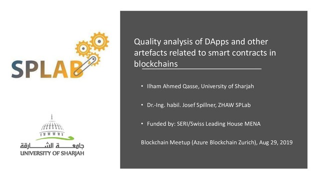 contracts in blockchains • Ilham Ahmed Qasse, University of Sharjah • Dr.-Ing. habil. Josef Spillner, ZHAW SPLab • Funded by: SERI/Swiss Leading House MENA Blockchain Meetup (Azure Blockchain Zurich), Aug 29, 2019