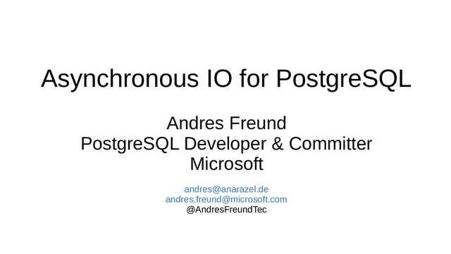 This talk will discuss the outcome of a prototype to add asynchronous IO support to PostgreSQL. The talk will discuss: - How would async IO support for PG look like architecturally? - Performance numbers - What sub-problems exist that can be integrated separately - Currently that prototype uses linux' new io_uring asynchronous IO support - Which other OSs can be supported? Do we need to provide emulation of OS level async IO?