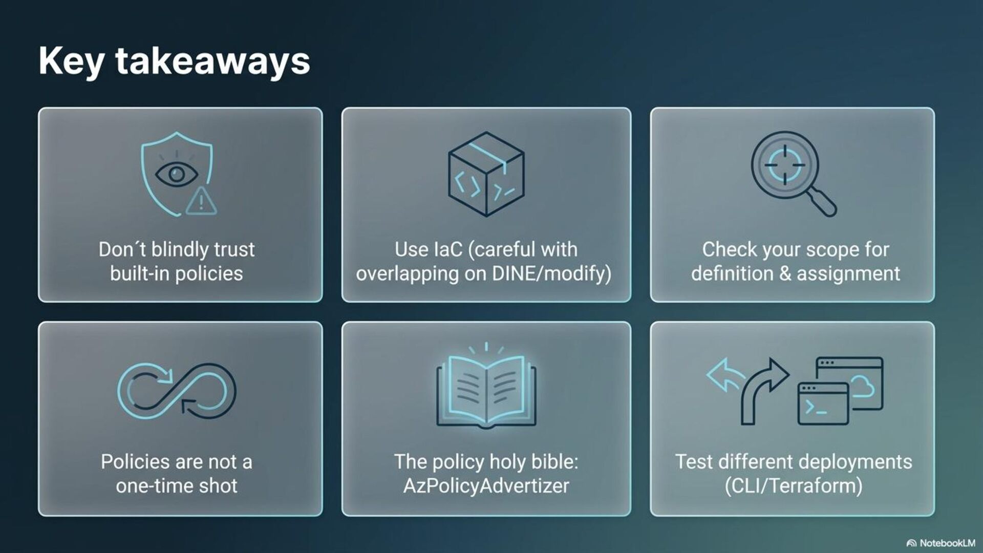 This session is about how to ensure a secure & compliant cloud environment with Azure Policies. It shows how it works, how to use them & what are the best practices in the development process. It also shows pitfalls and technical issue examples in a demo section