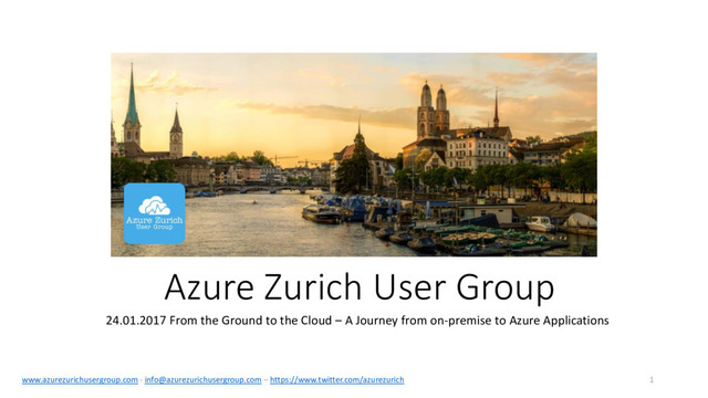 How not to get lost in Azure • Break: Pizza & Beer • Talk 2: A Journey from on-premise to the Cloud • Ca. 20:00 End www.azurezurichusergroup.com - [email protected] – https://www.twitter.com/azurezurich 2