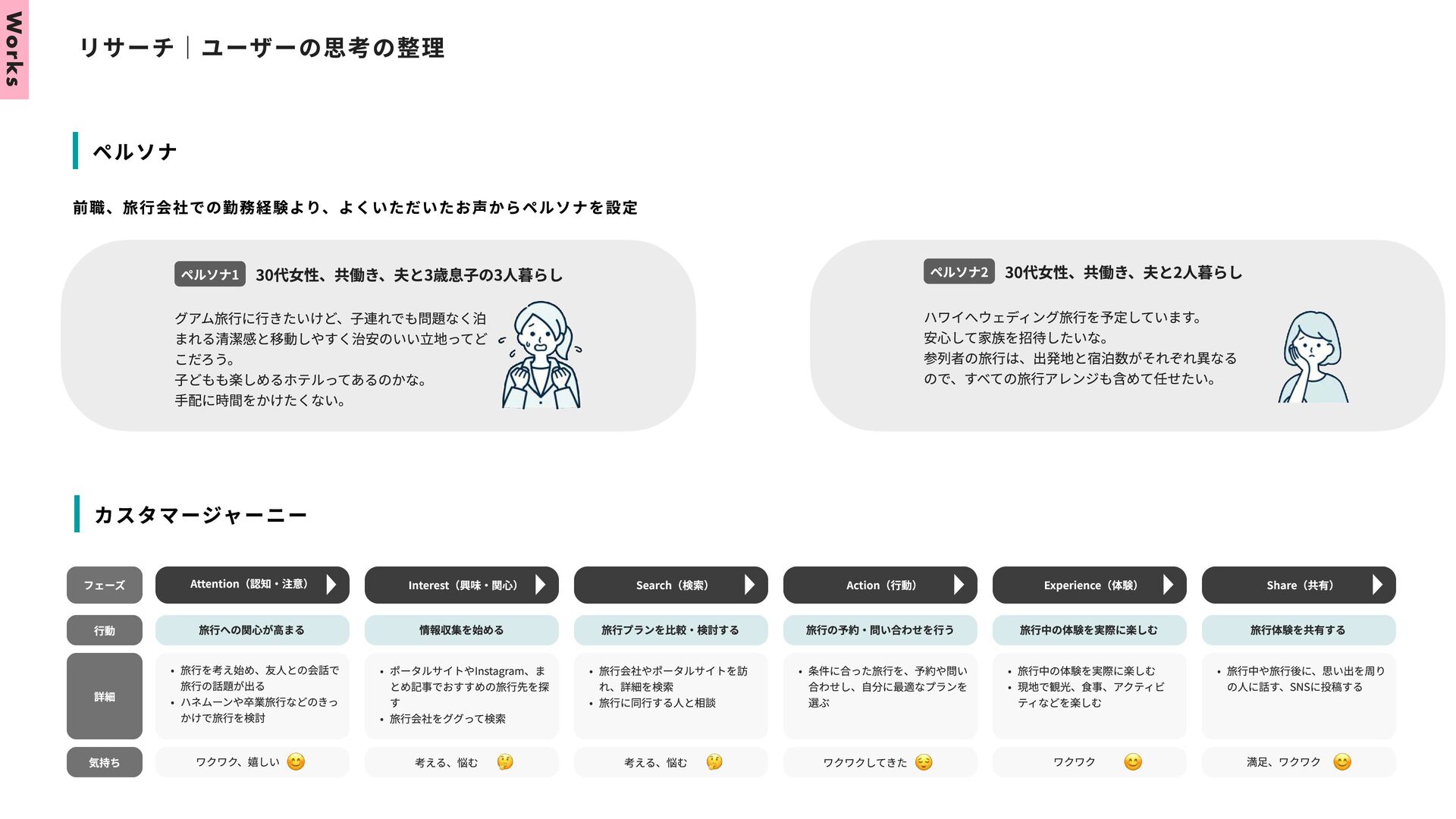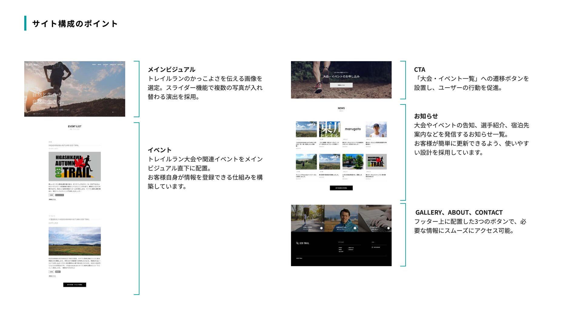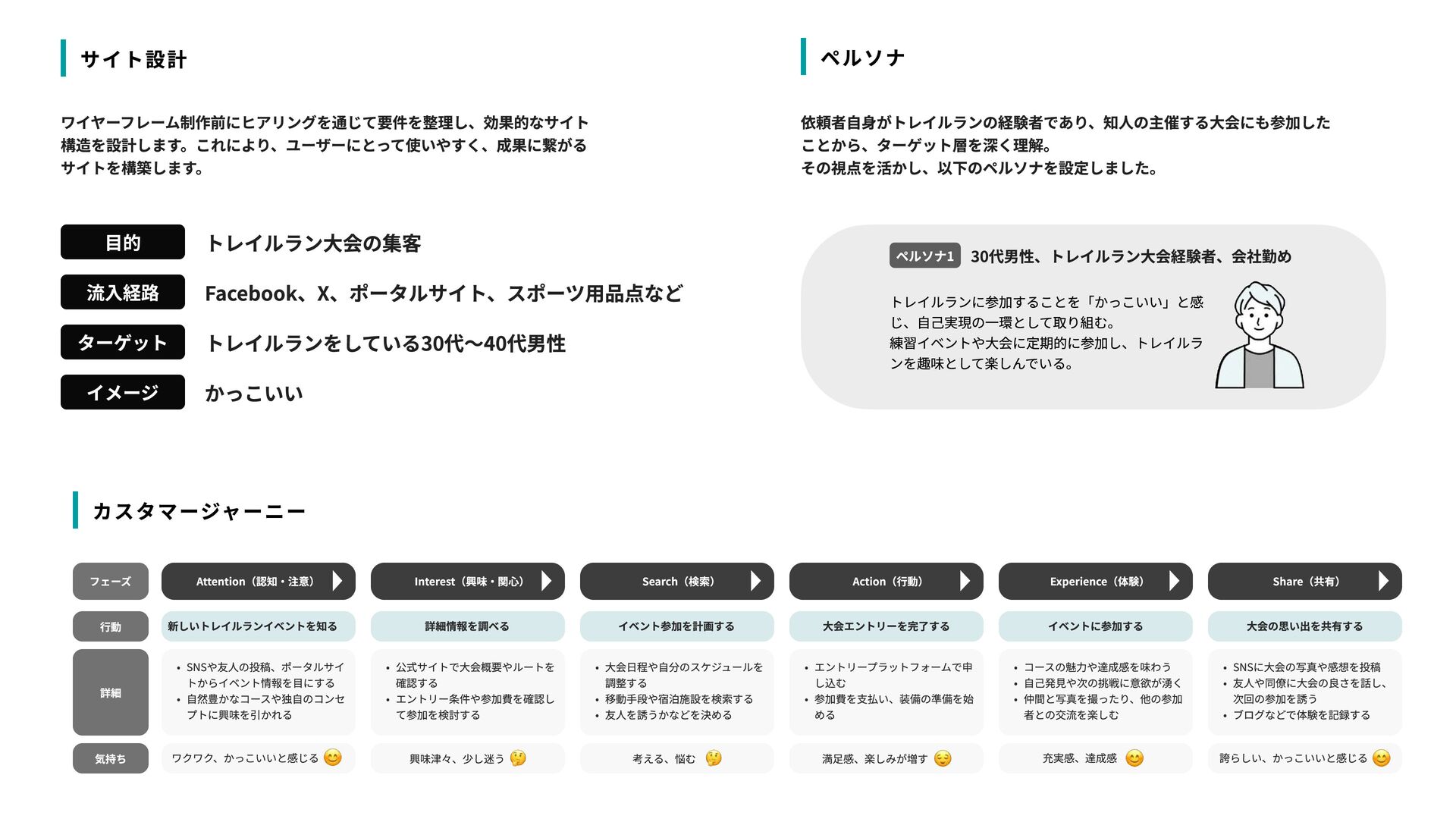 構造を設計します。これにより、ユーザーにとって使いやすく、成果に繋がる サイトを構築します。 カスタマージャーニー フェーズ 行動 詳細 気持ち Attention(認知・注意) 新しいトレイルランイベントを知る Û SNSや友人の投稿、ポータルサイ トからイベント情報を目にす· Û 自然豊かなコースや独自のコンセ プトに興味を引かれる ワクワク、かっこいいと感じる Interest(興味・関心) 詳細情報を調べる Û 公式サイトで大会概要やルートを 確認す· Û エントリー条件や参加費を確認し て参加を検討する 興味津々、少し迷う Search(検索) イベント参加を計画する Û 大会日程や自分のスケジュールを 調整す· Û 移動手段や宿泊施設を検索す· Û 友人を誘うかなどを決める 考える、悩む Action(行動) 大会エントリーを完了する Û エントリープラットフォームで申 し込 Û 参加費を支払い、装備の準備を始 める 満足感、楽しみが増す Experience(体験) イベントに参加する Û コースの魅力や達成感を味わÍ Û 自己発見や次の挑戦に意欲が湧Ö Û 仲間と写真を撮ったり、他の参加 者との交流を楽しむ 充実感、達成感 Share(共有) 大会の思い出を共有する Û SNSに大会の写真や感想を投" Û 友人や同僚に大会の良さを話し、 次回の参加を誘Í Û ブログなどで体験を記録する 誇らしい、かっこいいと感じる ペルソナ 依頼者自身がトレイルランの経験者であり、知人の主催する大会にも参加した ことから、ターゲット層を深く理解。 その視点を活かし、以下のペルソナを設定しました。 ペルソナ1 30代男性、トレイルラン大会経験者、会社勤め トレイルランに参加することを「かっこいい」と感 じ、自己実現の一環として取り組む。 練習イベントや大会に定期的に参加し、トレイルラ ンを趣味として楽しんでいる。