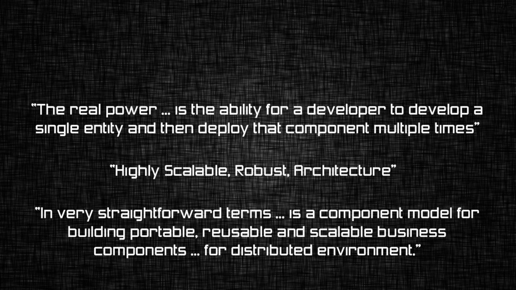 to develop a single entity and then deploy that component multiple times” “Highly Scalable, Robust, Architecture” “In very straightforward terms ... is a component model for building portable, reusable and scalable business components ... for distributed environment.”