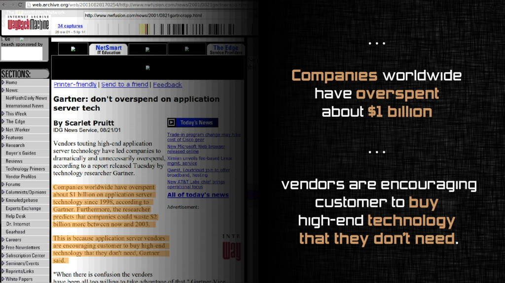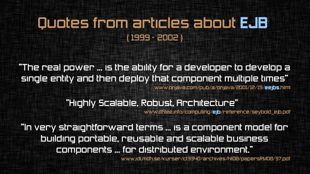 to develop a single entity and then deploy that component multiple times” www.onjava.com/pub/a/onjava/2001/12/19/eejbs.html “Highly Scalable, Robust, Architecture” www.dhlee.info/computing/ejb/reference/seybold_ejb.pdf “In very straightforward terms ... is a component model for building portable, reusable and scalable business components ... for distributed environment.” www.idt.mdh.se/kurser/ct3340/archives/ht08/papersRM08/37.pdf Quotes from articles about EJB ( 1999 – 2002 )