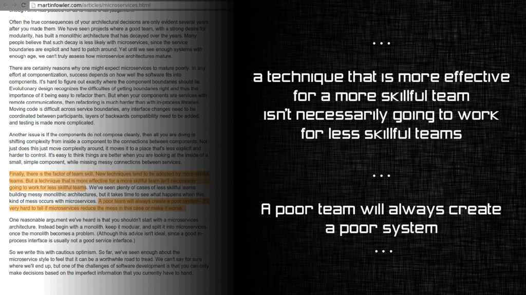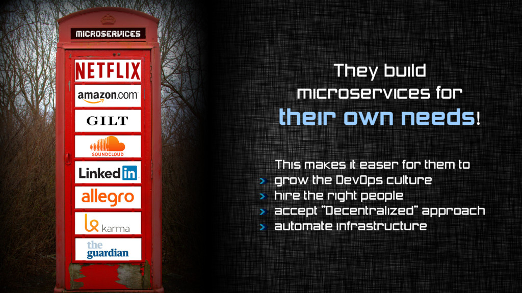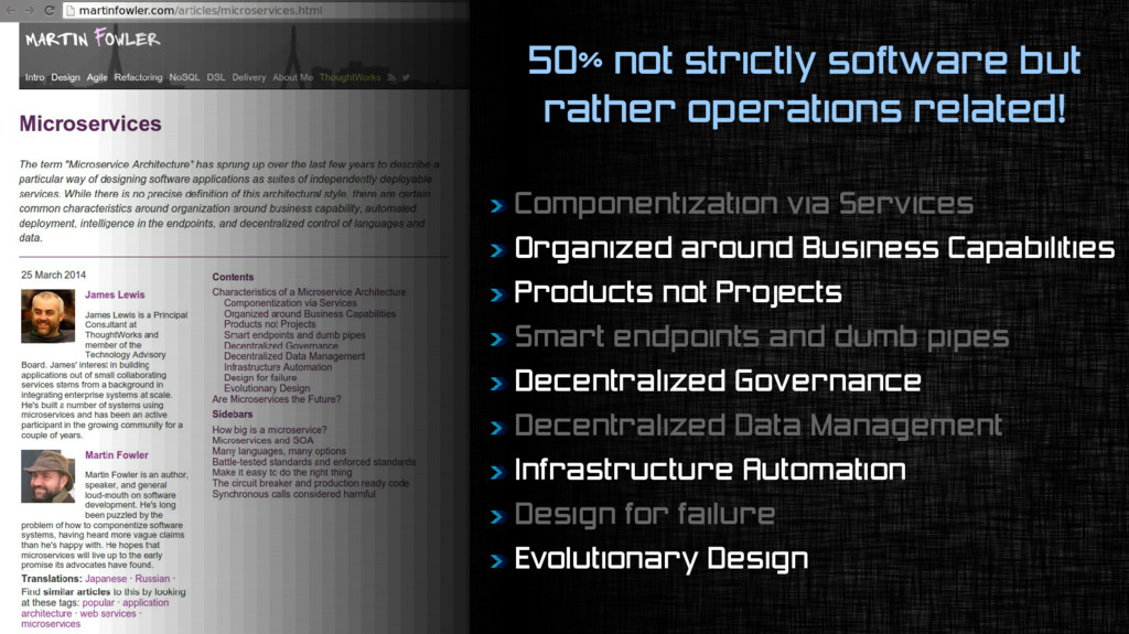 Smart endpoints and dumb pipes Decentralized Governance Decentralized Data Management Infrastructure Automation Design for failure Evolutionary Design 50% not strictly software but rather operations related!