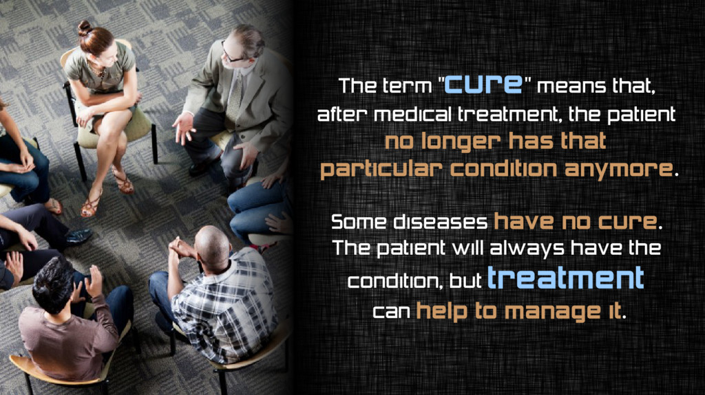 no longer has that particular condition anymore. Some diseases have no cure. The patient will always have the condition, but treatment can help to manage it.