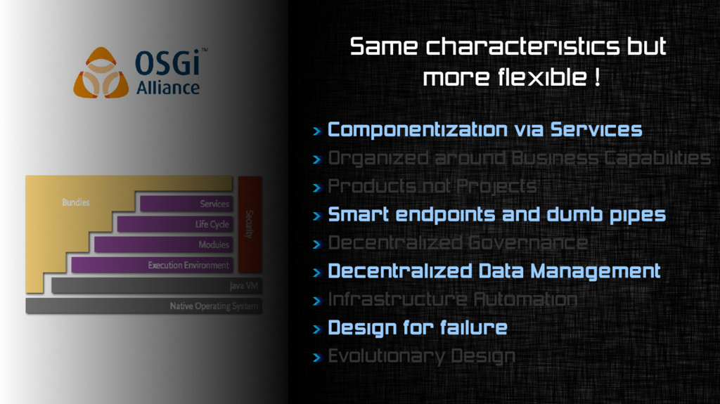 Smart endpoints and dumb pipes Decentralized Governance Decentralized Data Management Infrastructure Automation Design for failure Evolutionary Design Same characteristics but more flexible !
