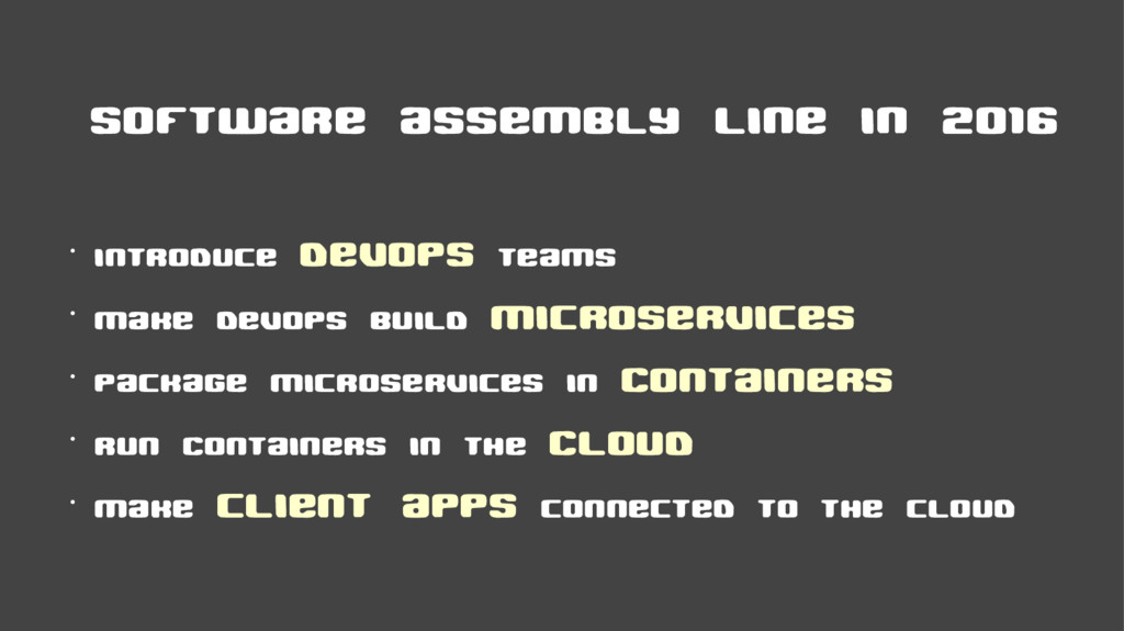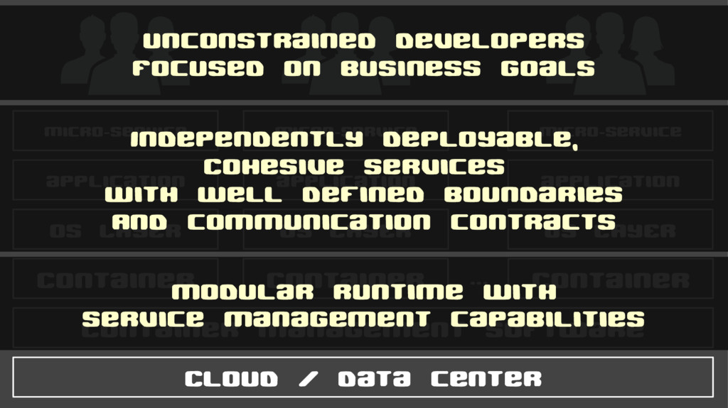 ... OS LAYER application Micro-service OS LAYER application Micro-service OS LAYER application Micro-service modular runtime with Service management capabilities Independently deployable, Cohesive services with well defined boundaries And communication contracts Unconstrained developers Focused on business goals