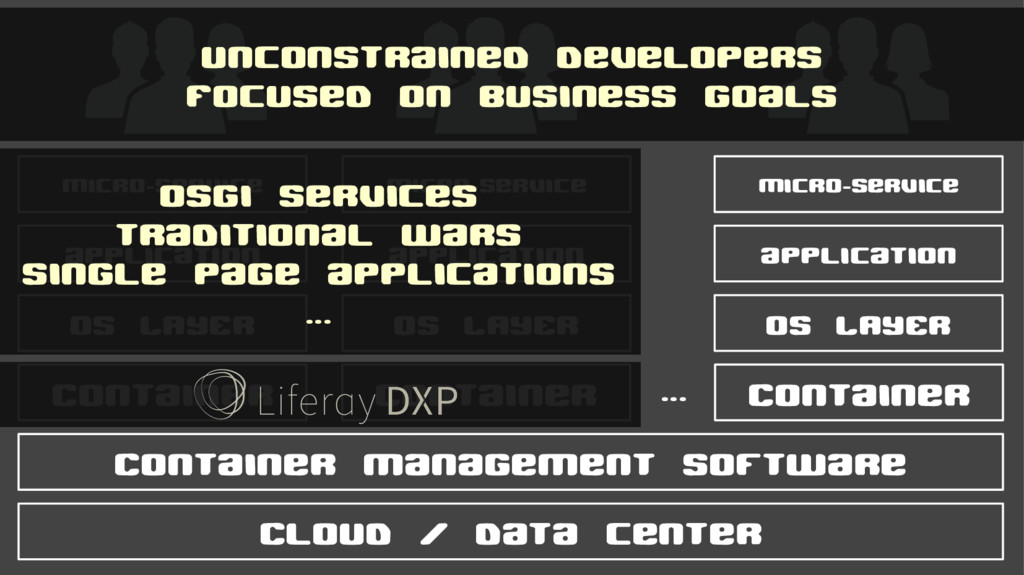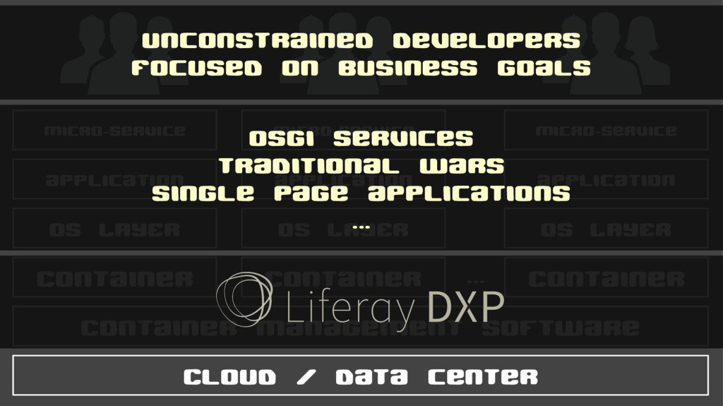 ... OS LAYER application Micro-service OS LAYER application Micro-service OS LAYER application Micro-service OSGi services traditional wars single page applications ... Unconstrained developers Focused on business goals