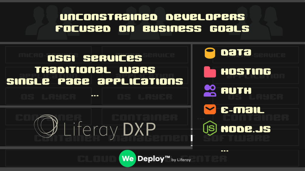 ... OS LAYER application Micro-service OS LAYER application Micro-service OS LAYER application Micro-service Unconstrained developers Focused on business goals OSGi services traditional wars single page applications ... Data Hosting Auth E-mail Node.js ...