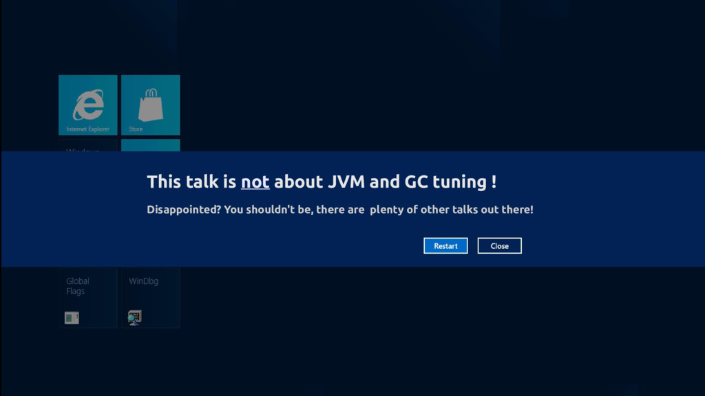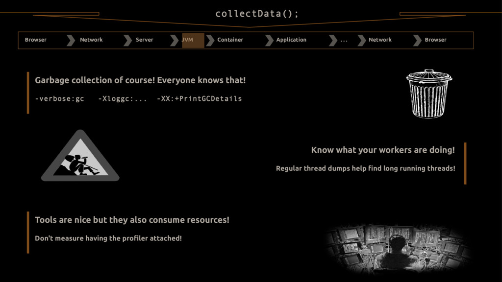 . Know what your workers are doing! Regular thread dumps help find long running threads! Garbage collection of course! Everyone knows that! -verbose:gc -Xloggc:... -XX:+PrintGCDetails Tools are nice but they also consume resources! Don't measure having the profiler attached! collectData(); collectData();