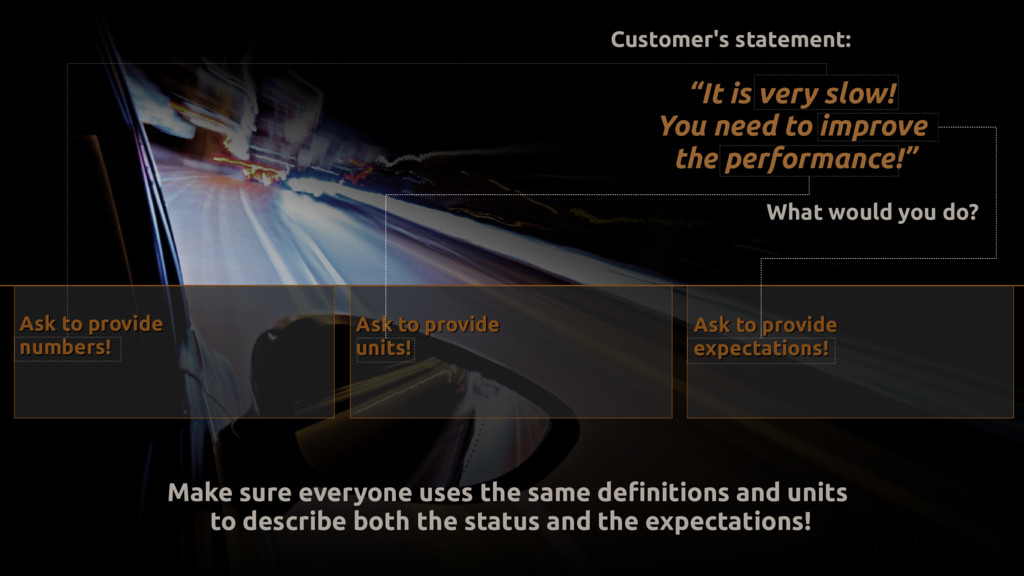provide Ask to provide expectations! expectations! Ask to provide Ask to provide units! units! Customer's statement: “It is very slow! You need to improve the performance!” What would you do? Make sure everyone uses the same definitions and units to describe both the status and the expectations!