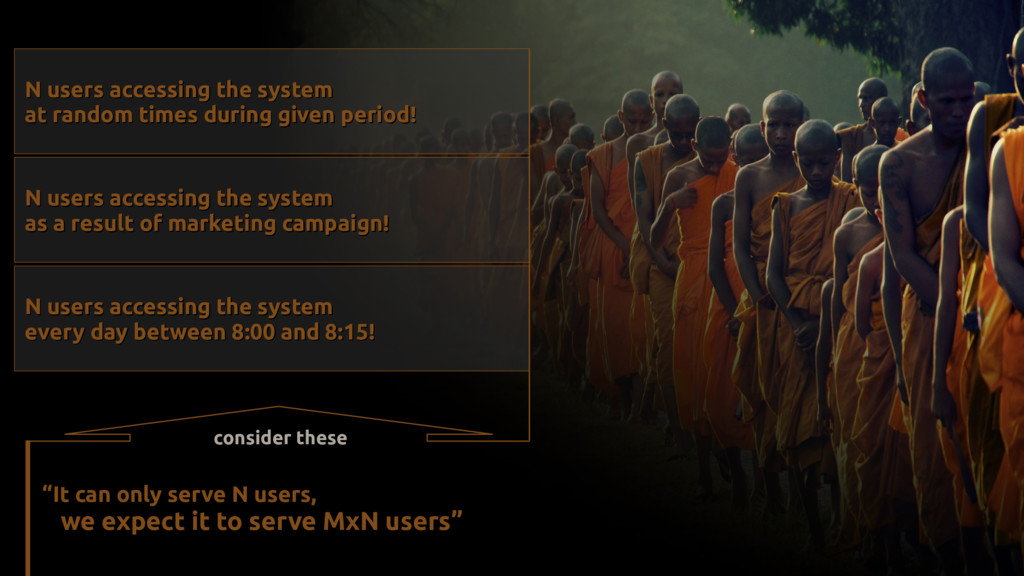 serve MxN users” N users accessing the system N users accessing the system at random times during given period! at random times during given period! N users accessing the system N users accessing the system as a result of marketing campaign! as a result of marketing campaign! N users accessing the system N users accessing the system every day between 8:00 and 8:15! every day between 8:00 and 8:15! consider these