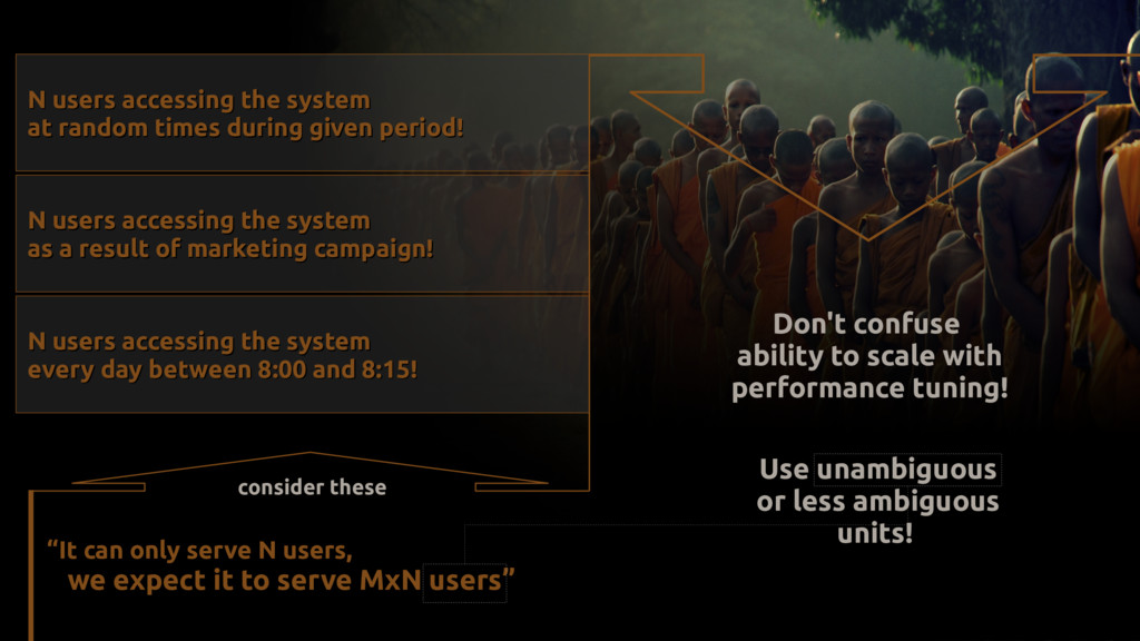 serve MxN users” N users accessing the system N users accessing the system at random times during given period! at random times during given period! N users accessing the system N users accessing the system as a result of marketing campaign! as a result of marketing campaign! N users accessing the system N users accessing the system every day between 8:00 and 8:15! every day between 8:00 and 8:15! consider these Don't confuse ability to scale with performance tuning! Use unambiguous or less ambiguous units!