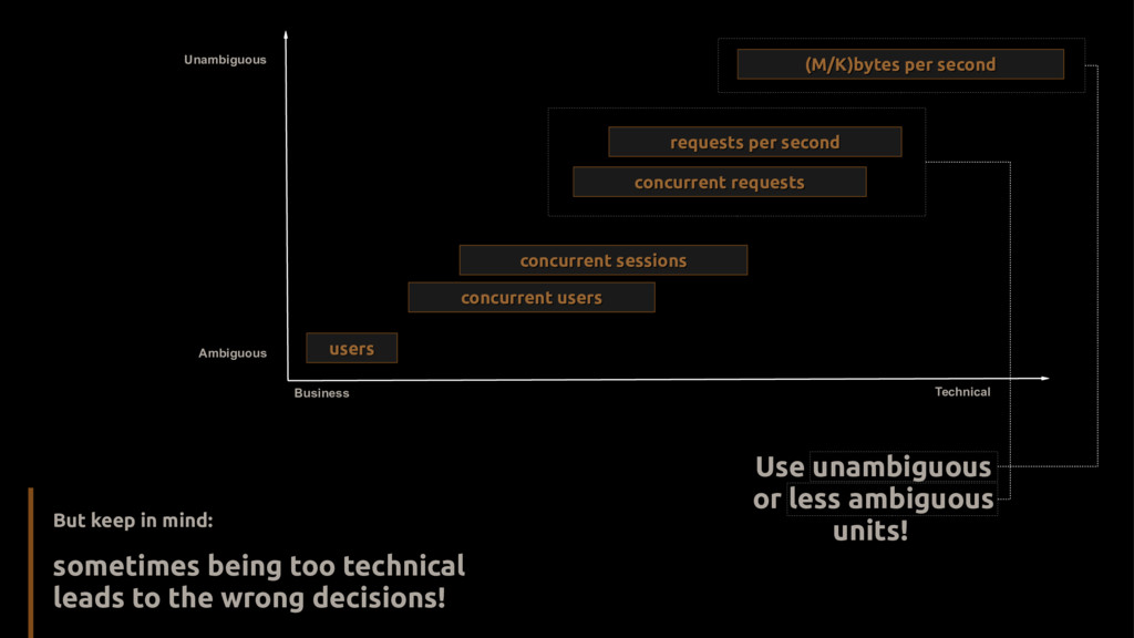 concurrent sessions concurrent sessions concurrent requests concurrent requests requests per second requests per second (M/K)bytes per second (M/K)bytes per second But keep in mind: sometimes being too technical leads to the wrong decisions! Use unambiguous or less ambiguous units!