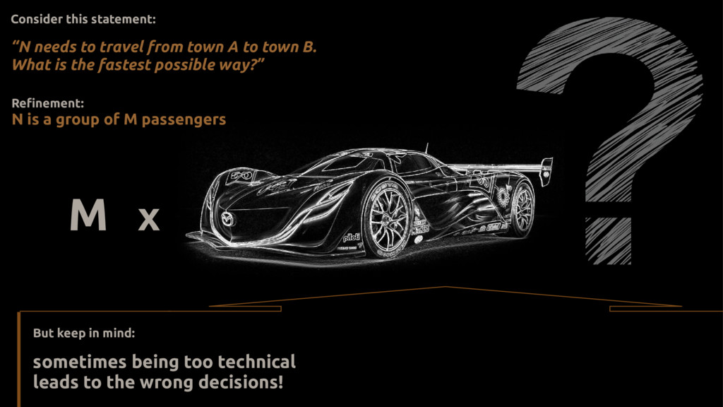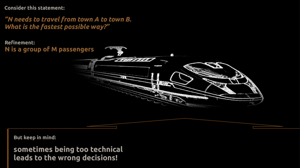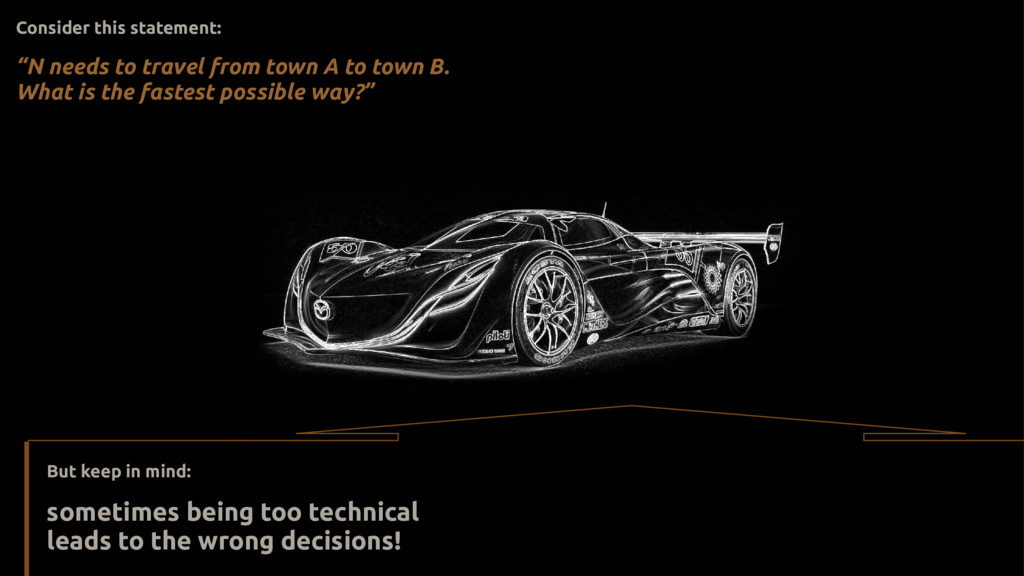 statement: “N needs to travel from town A to town B. What is the fastest possible way?” But keep in mind: sometimes being too technical leads to the wrong decisions!