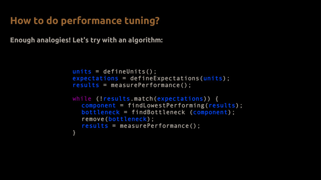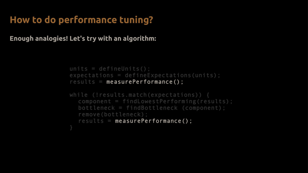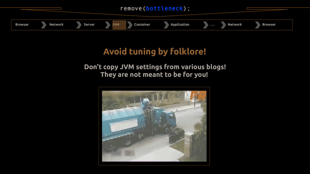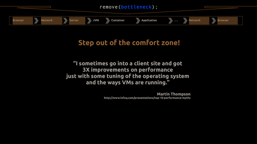 . “I sometimes go into a client site and got 3X improvements on performance just with some tuning of the operating system and the ways VMs are running.” Martin Thompson http://www.infoq.com/presentations/top-10-performance-myths Step out of the comfort zone! remove( remove(bottleneck bottleneck); );