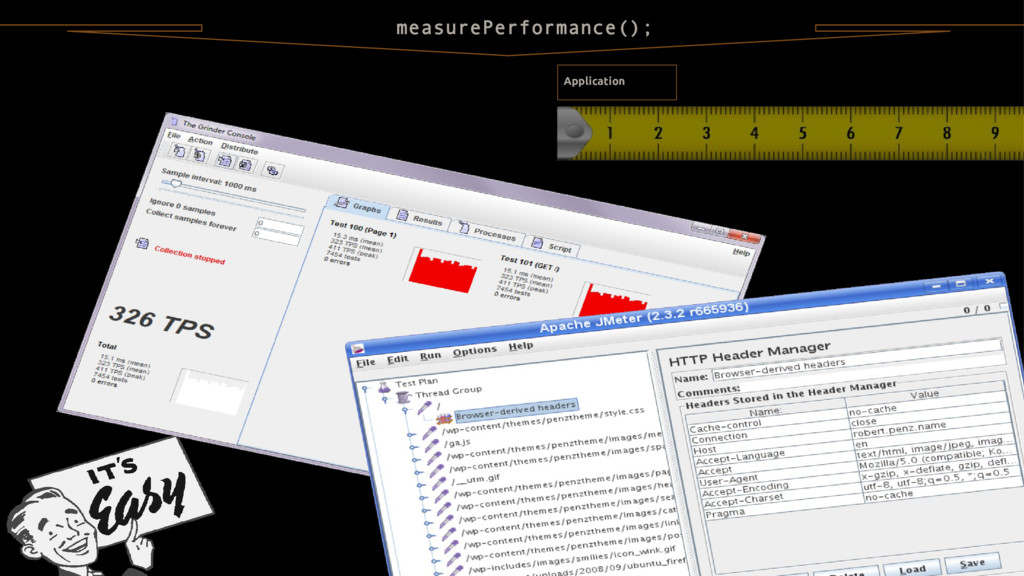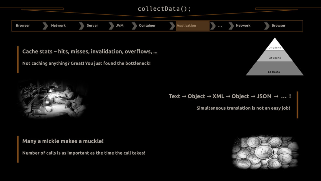 . Text Object XML Object JSON … ! → → → → → Simultaneous translation is not an easy job! Many a mickle makes a muckle! Many a mickle makes a muckle! Number of calls is as important as the time the call takes! Number of calls is as important as the time the call takes! Cache stats – hits, misses, invalidation, overflows, ... Not caching anything? Great! You just found the bottleneck! collectData(); collectData();