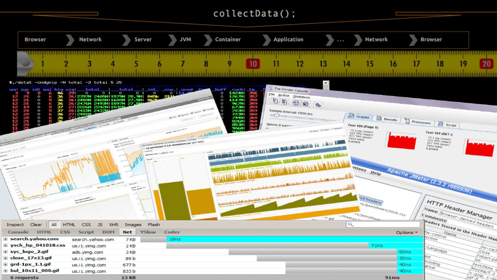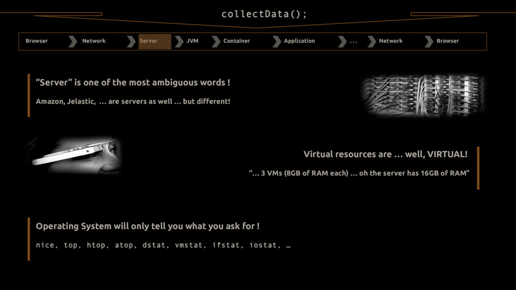 . “Server” is one of the most ambiguous words ! Amazon, Jelastic, … are servers as well … but different! Virtual resources are … well, VIRTUAL! “… 3 VMs (8GB of RAM each) … oh the server has 16GB of RAM” Operating System will only tell you what you ask for ! nice, top, htop, atop, dstat, vmstat, ifstat, iostat, … collectData(); collectData();