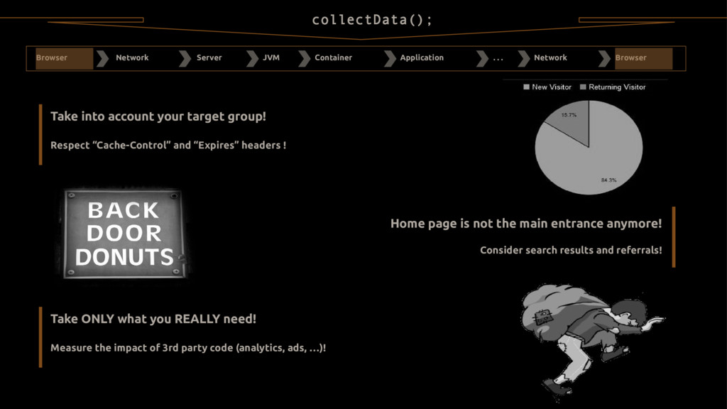 . Take into account your target group! Respect “Cache-Control” and “Expires” headers ! Home page is not the main entrance anymore! Consider search results and referrals! Take ONLY what you REALLY need! Measure the impact of 3rd party code (analytics, ads, …)! collectData(); collectData();