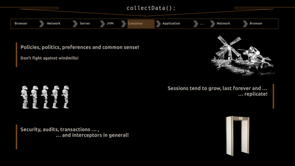 . Policies, politics, preferences and common sense! Don't fight against windmills! Sessions tend to grow, last forever and … … replicate! Security, audits, transactions … , Security, audits, transactions … , … … and interceptors in general! and interceptors in general! collectData(); collectData();