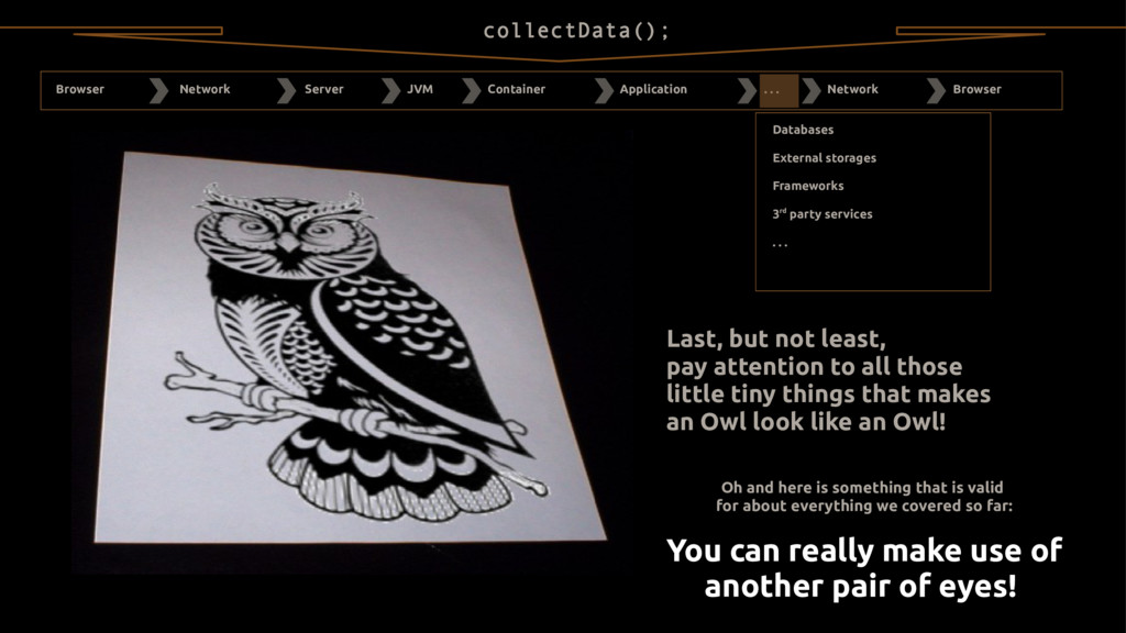 . Databases External storages Frameworks 3rd party services . . . Last, but not least, pay attention to all those little tiny things that makes an Owl look like an Owl! Oh and here is something that is valid for about everything we covered so far: You can really make use of another pair of eyes! collectData(); collectData();