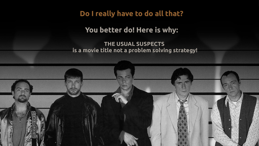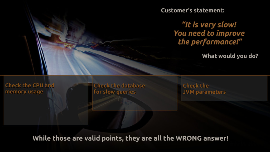 memory usage Check the Check the JVM parameters JVM parameters Check the database Check the database for slow queries for slow queries While those are valid points, they are all the WRONG answer! Customer's statement: “It is very slow! You need to improve the performance!” What would you do?