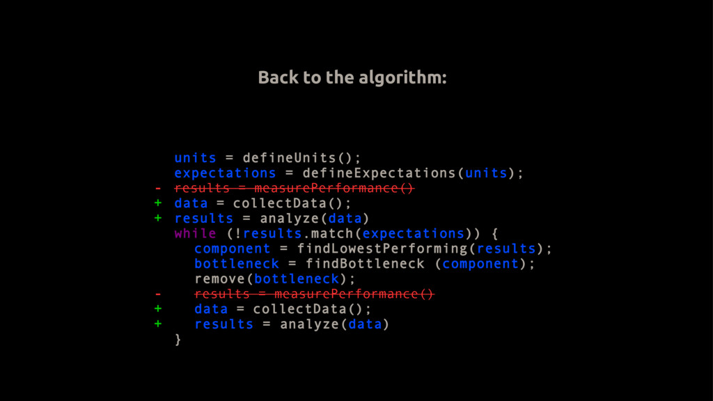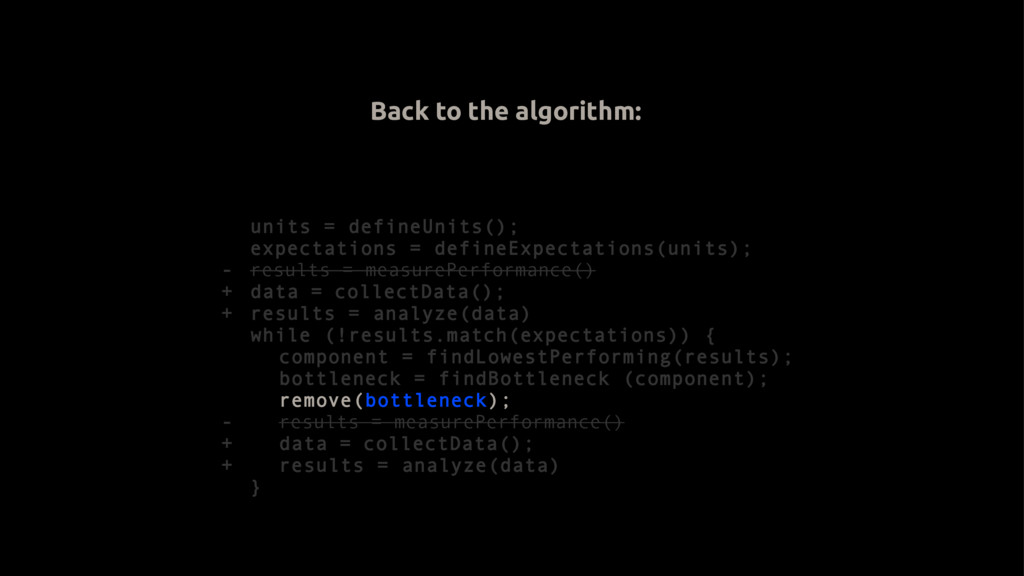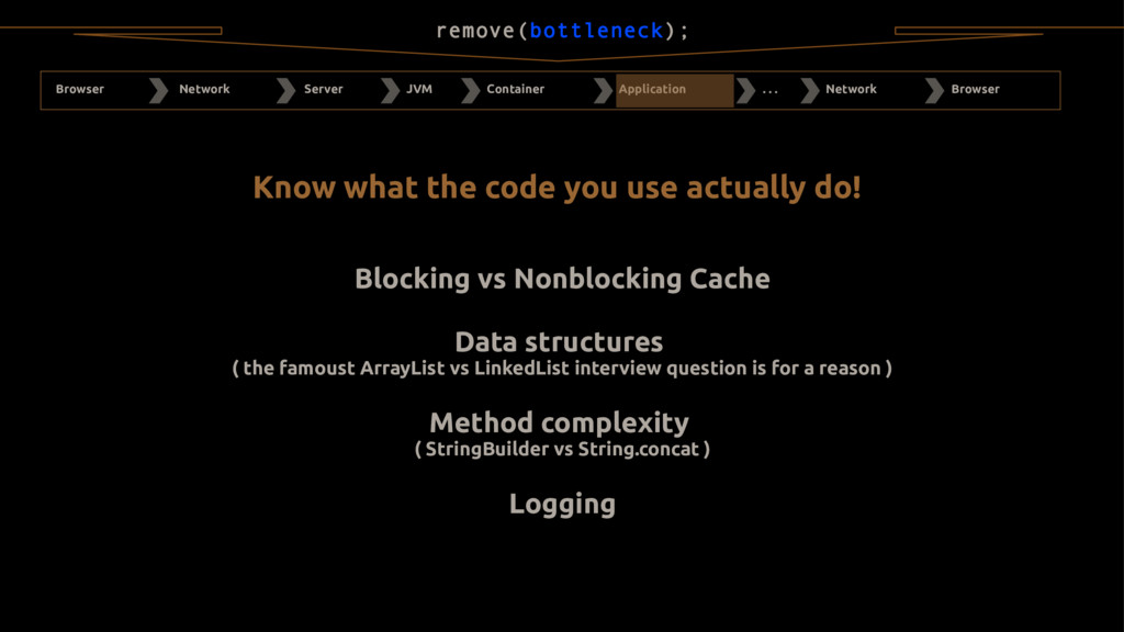 . Blocking vs Nonblocking Cache Data structures ( the famoust ArrayList vs LinkedList interview question is for a reason ) Method complexity ( StringBuilder vs String.concat ) Logging Know what the code you use actually do! remove( remove(bottleneck bottleneck); );