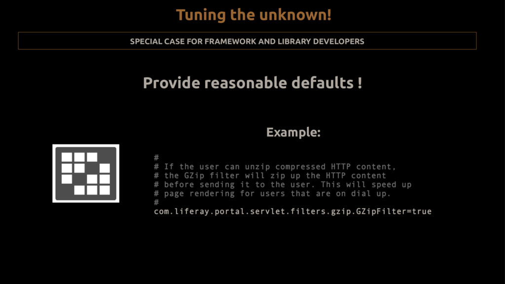 can unzip compressed HTTP content, # the GZip filter will zip up the HTTP content # before sending it to the user. This will speed up # page rendering for users that are on dial up. # com.liferay.portal.servlet.filters.gzip.GZipFilter=true SPECIAL CASE FOR FRAMEWORK AND LIBRARY DEVELOPERS Tuning the unknown!