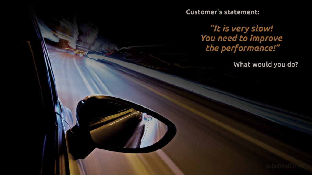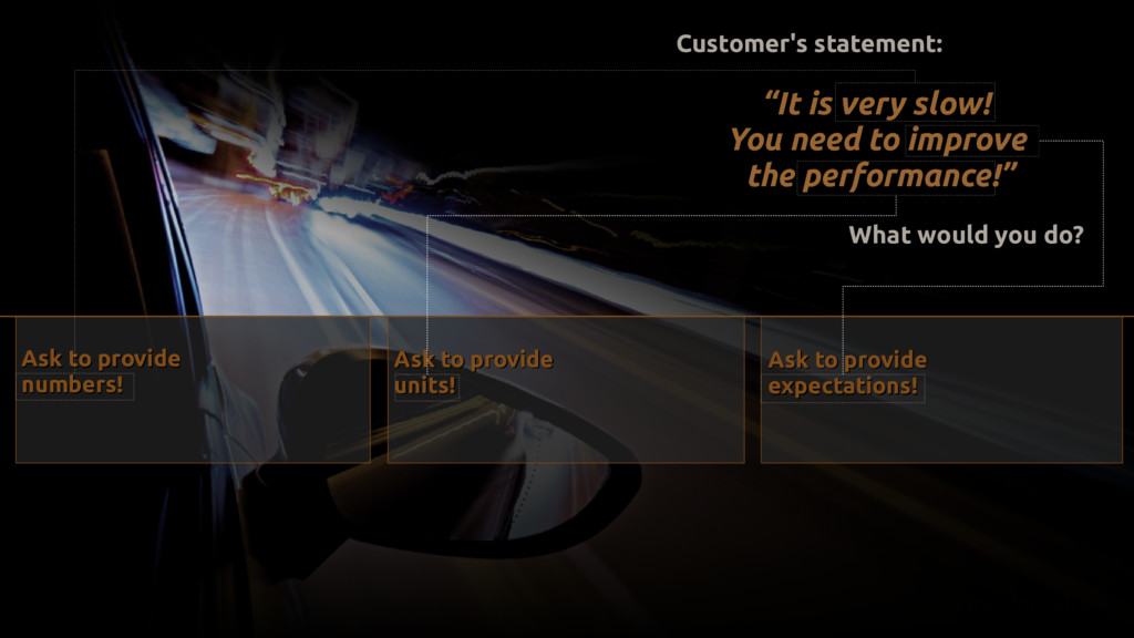 provide Ask to provide expectations! expectations! Ask to provide Ask to provide units! units! Customer's statement: “It is very slow! You need to improve the performance!” What would you do?