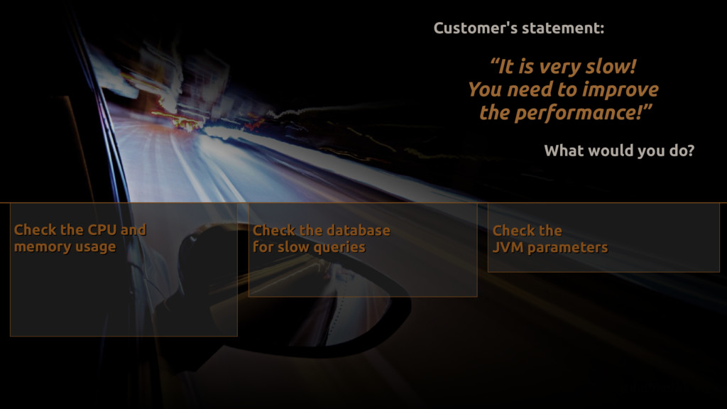 the performance!” What would you do? Check the CPU and Check the CPU and memory usage memory usage Check the Check the JVM parameters JVM parameters Check the database Check the database for slow queries for slow queries