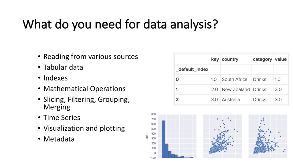 various sources • Tabular data • Indexes • Mathematical Operations • Slicing, Filtering, Grouping, Merging • Time Series • Visualization and plotting • Metadata