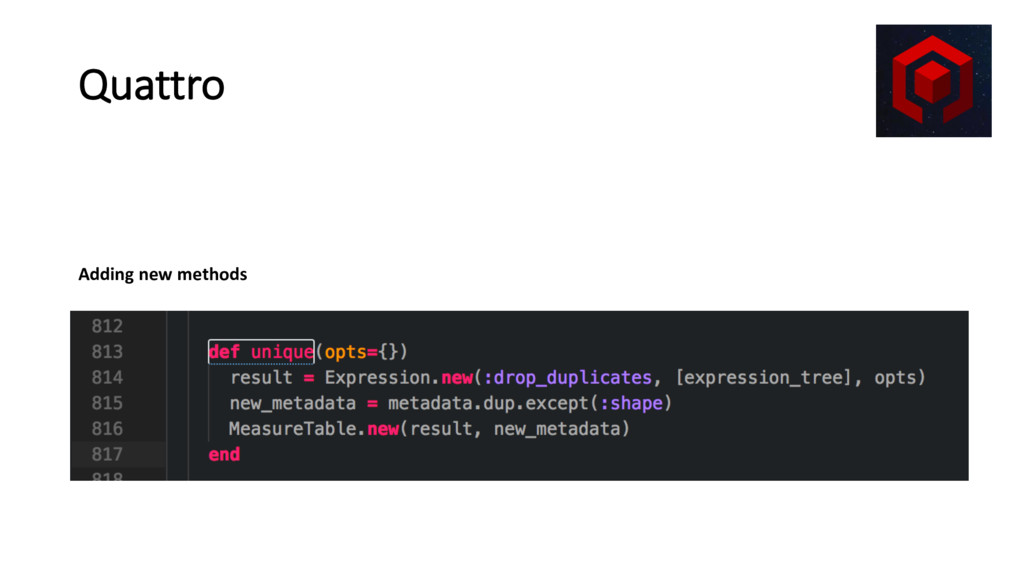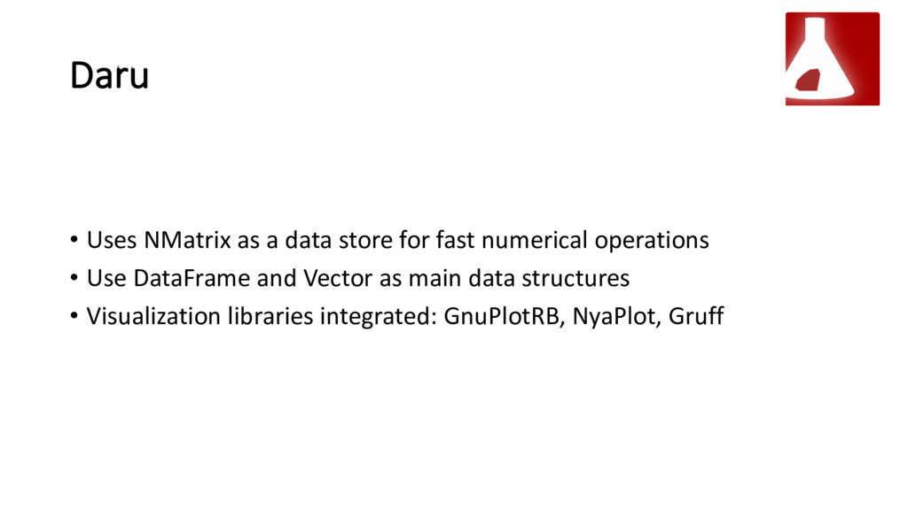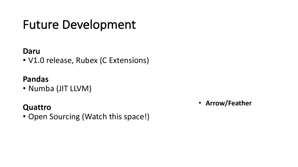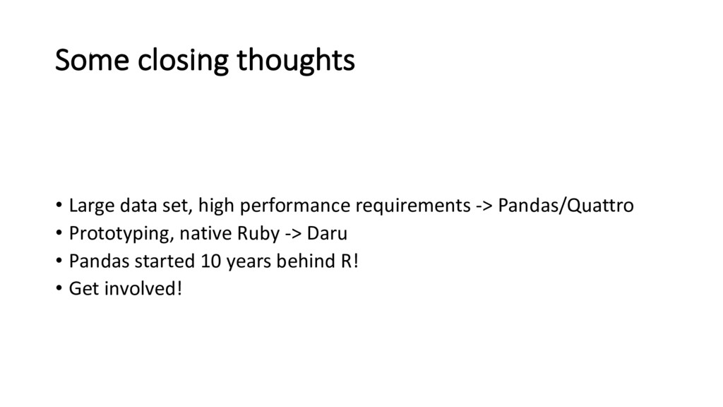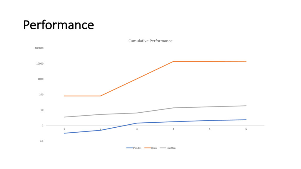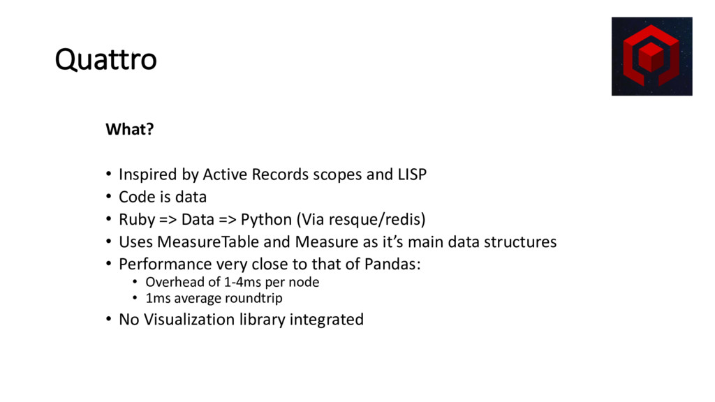 • Code is data • Ruby => Data => Python (Via resque/redis) • Uses MeasureTable and Measure as it’s main data structures • Performance very close to that of Pandas: • Overhead of 1-4ms per node • 1ms average roundtrip • No Visualization library integrated