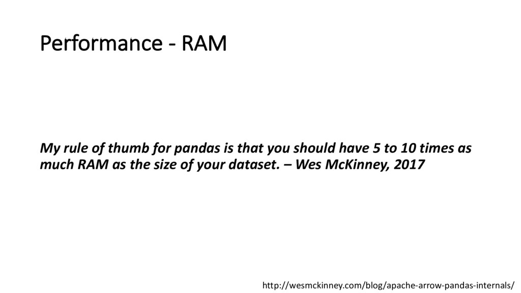 that you should have 5 to 10 times as much RAM as the size of your dataset. – Wes McKinney, 2017 http://wesmckinney.com/blog/apache-arrow-pandas-internals/