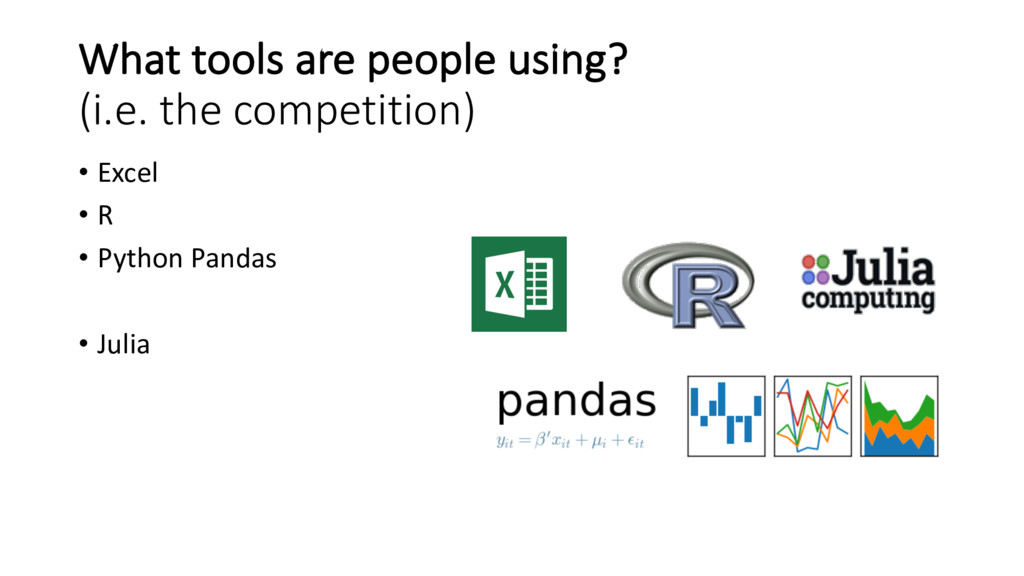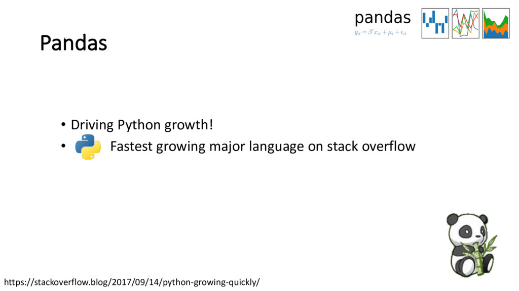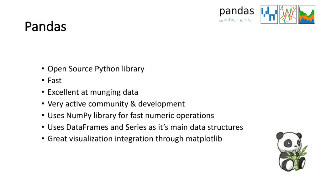 at munging data • Very active community & development • Uses NumPy library for fast numeric operations • Uses DataFrames and Series as it’s main data structures • Great visualization integration through matplotlib