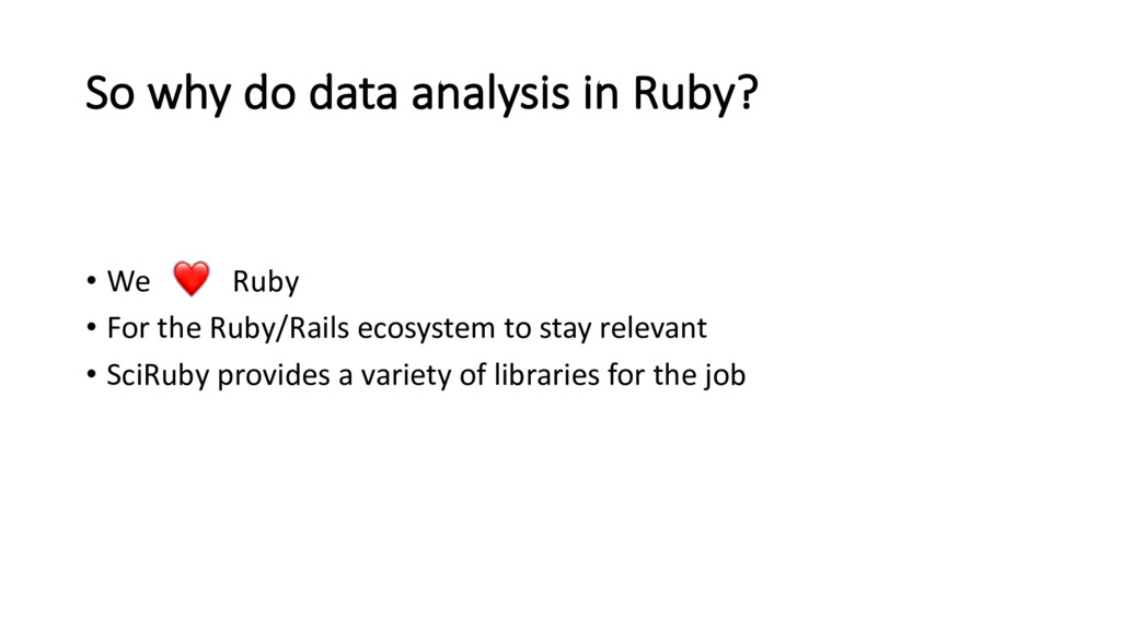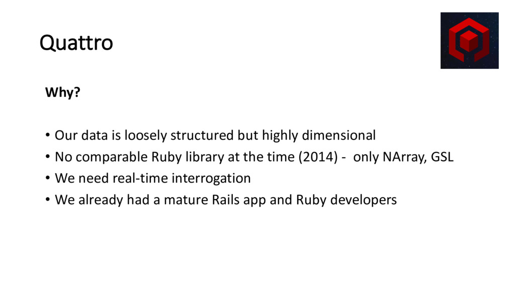 dimensional • No comparable Ruby library at the time (2014) - only NArray, GSL • We need real-time interrogation • We already had a mature Rails app and Ruby developers