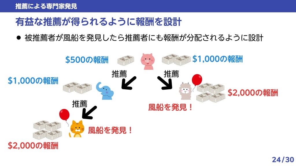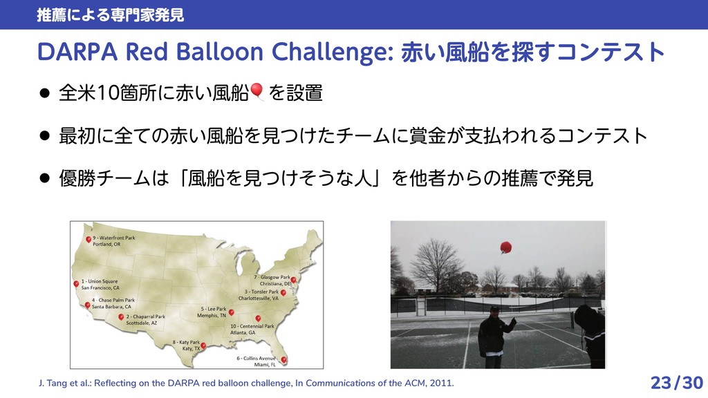 23 contributed articles platform for viral collaboration that used recursive incentives to align the public’s interest with the goal of win- ning the Challenge. This approach was inspired by the work of Peter S. Dodds et al.5 that found that success in us- ing social networks to tackle widely distributed search problems depends on individual incentives. The work of Mason and Watts7 also informed the use of financial incentives to motivate crowdsourcing productivity. The MIT team’s winning strategy was to use the prize money as a finan- cial incentive structure rewarding not only the people who correctly located balloons but also those connecting the finder to the MIT team. Should the team win, they would allocate $4,000 in prize money to each balloon. They Figure 1. Locations in the DARPA Red Balloon Challenge. Figure 2. Example recursive incentive-structure process for the MIT team. J. Tang et al.: Reflecting on the DARPA red balloon challenge, In Communications of the ACM, 2011.
