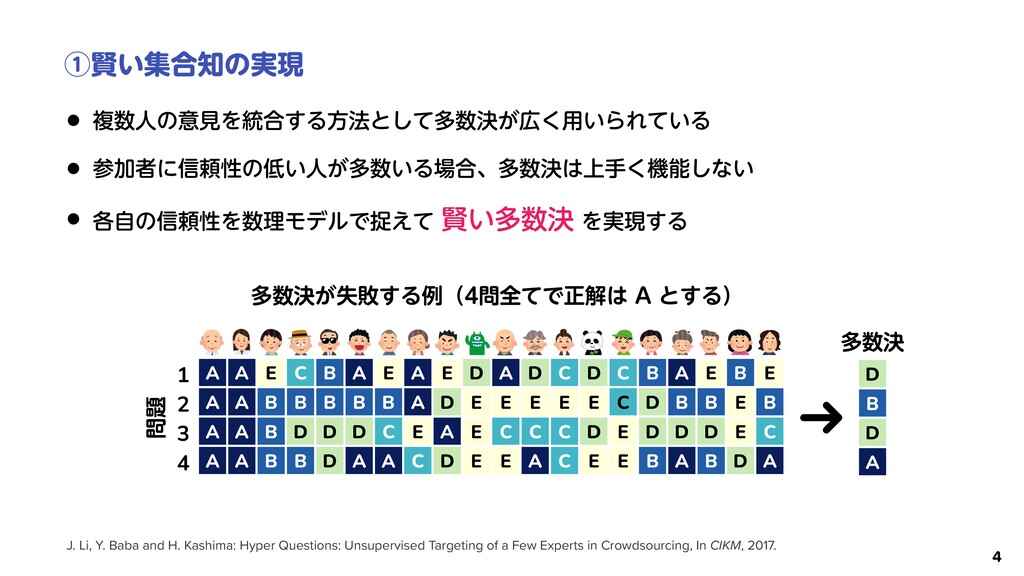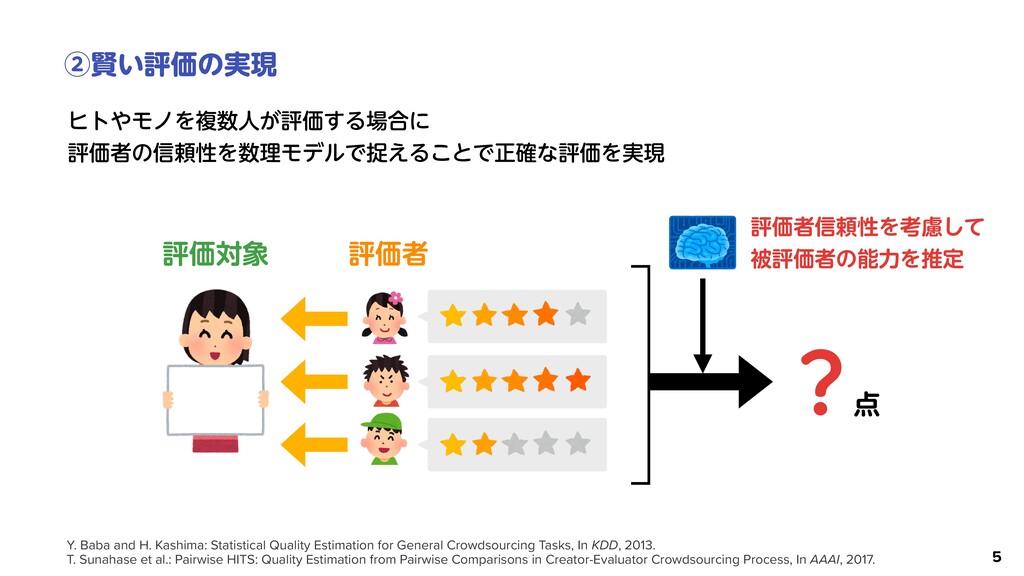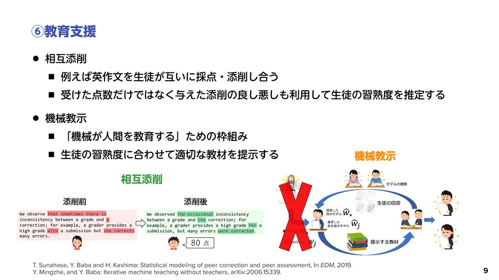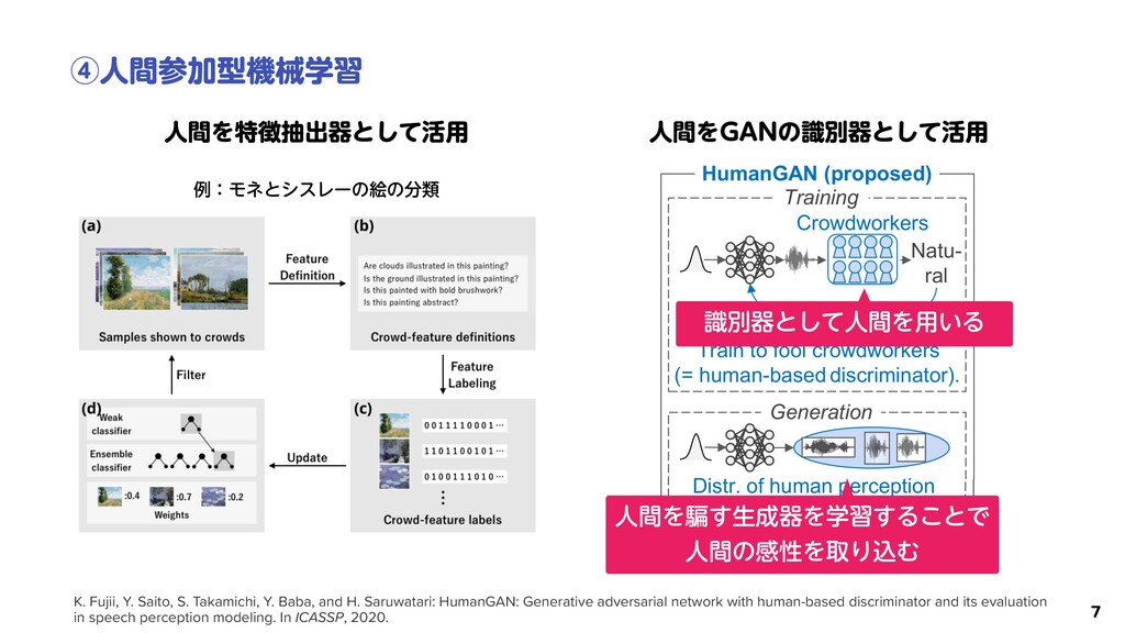 Japan. Information Science and Technology, The University of Tokyo, Japan. ineering, Information and Systems, University of Tsukuba, Japan. CT enerative adversarial network ion as a discriminator. A ba- ent a real-data distribution by uishes real and generated data. esent the outside of a real-data ception, humans can recognize essed (i.e., a non-existent hu- human-acceptable distribution ne and cannot be modeled by an-acceptable distribution, we enerator training algorithm by ack-boxed discriminator. The training by using a computer . We evaluate our HumanGAN demonstrate that it can repre- Prior distr. Generated data Generator Discriminator Natu- ral Train to fool computer-based discriminator. GAN Training Distr. of training data Generation Distr. of human perception Fig. 1. Comparison of basic GAN and proposed HumanGAN. Basic GAN trains generator by fooling DNN-based discriminator (i.e., computer-based discriminator), and generator finally represents training-data distribution. In comparison, HumanGAN trains gener- ਓؒΛ᱐͢ੜثΛֶश͢Δ͜ͱͰ ਓؒͷײੑΛऔΓࠐΉ ྫɿϞωͱγεϨʔͷֆͷྨ ࣝผثͱͯ͠ਓؒΛ༻͍Δ K. Fujii, Y. Saito, S. Takamichi, Y. Baba, and H. Saruwatari: HumanGAN: Generative adversarial network with human-based discriminator and its evaluation in speech perception modeling. In ICASSP, 2020.