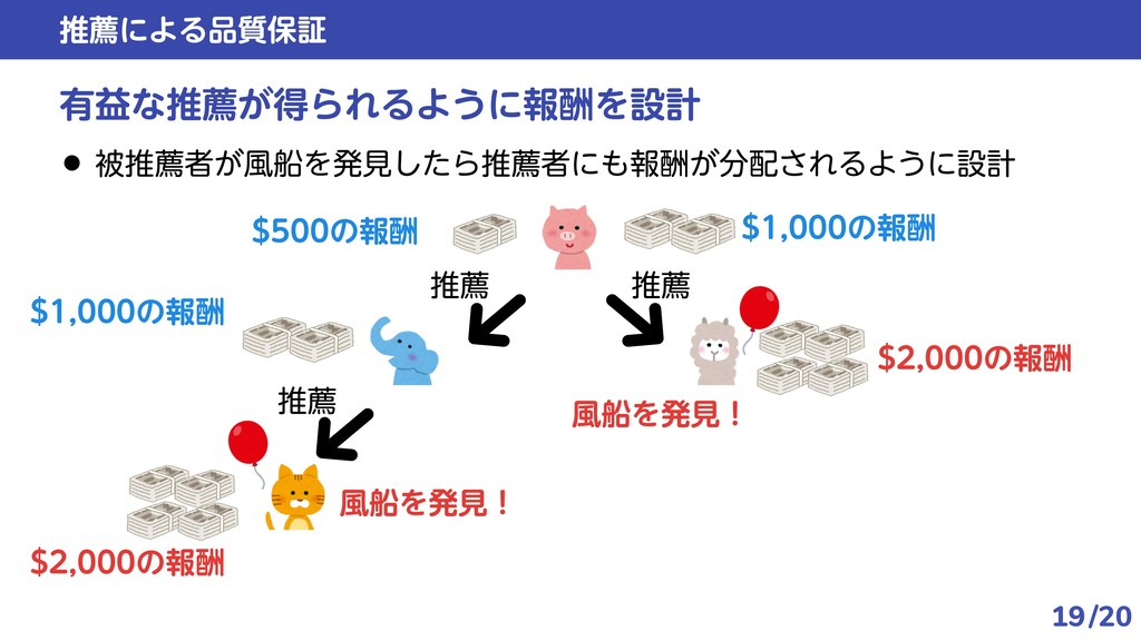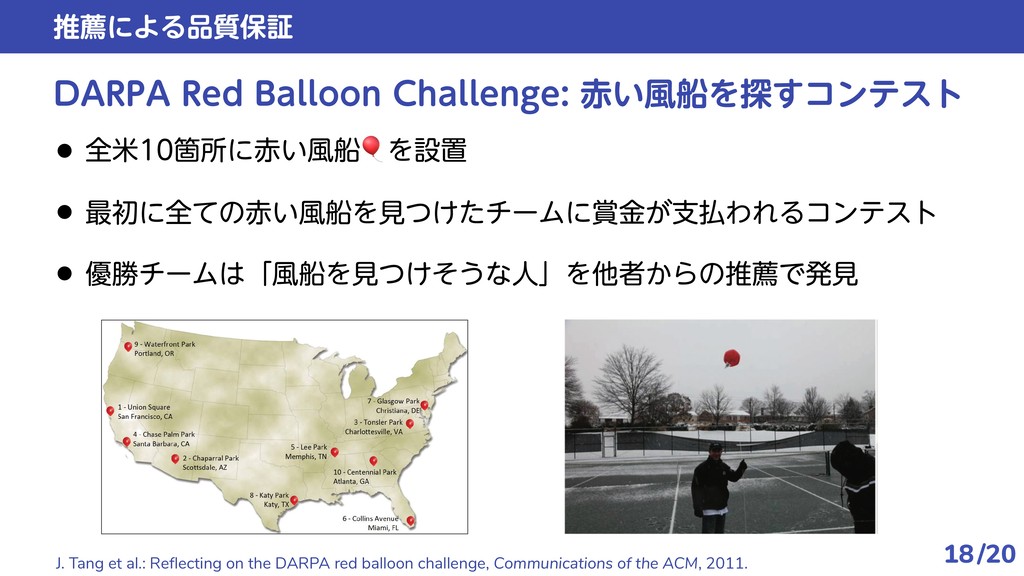 articles platform for viral collaboration that used recursive incentives to align the public’s interest with the goal of win- ning the Challenge. This approach was inspired by the work of Peter S. Dodds et al.5 that found that success in us- ing social networks to tackle widely distributed search problems depends on individual incentives. The work of Mason and Watts7 also informed the use of financial incentives to motivate crowdsourcing productivity. The MIT team’s winning strategy was to use the prize money as a finan- cial incentive structure rewarding not only the people who correctly located balloons but also those connecting the finder to the MIT team. Should the team win, they would allocate $4,000 in prize money to each balloon. They Figure 1. Locations in the DARPA Red Balloon Challenge. Figure 2. Example recursive incentive-structure process for the MIT team. 18 J. Tang et al.: Reflecting on the DARPA red balloon challenge, Communications of the ACM, 2011.