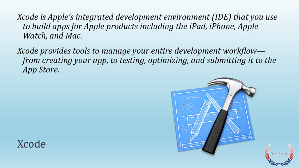 to build apps for Apple products including the iPad, iPhone, Apple Watch, and Mac. Xcode provides tools to manage your entire development workflow— from creating your app, to testing, optimizing, and submitting it to the App Store. Xcode
