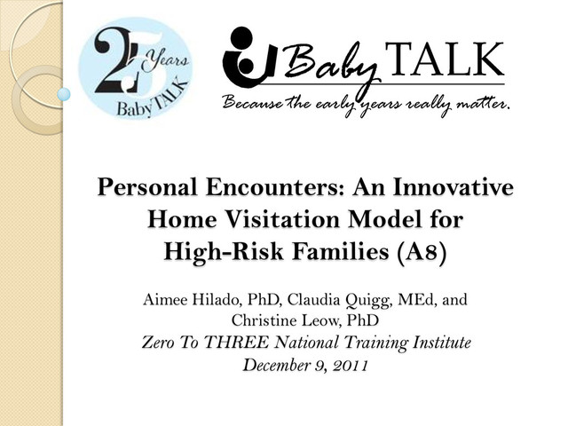 with high-risk families. Discuss innovative components of the model that support home-visiting services. Share current research on the Baby TALK model. Provide strategies for enhancing program effectiveness in the area of identification and recruitment.